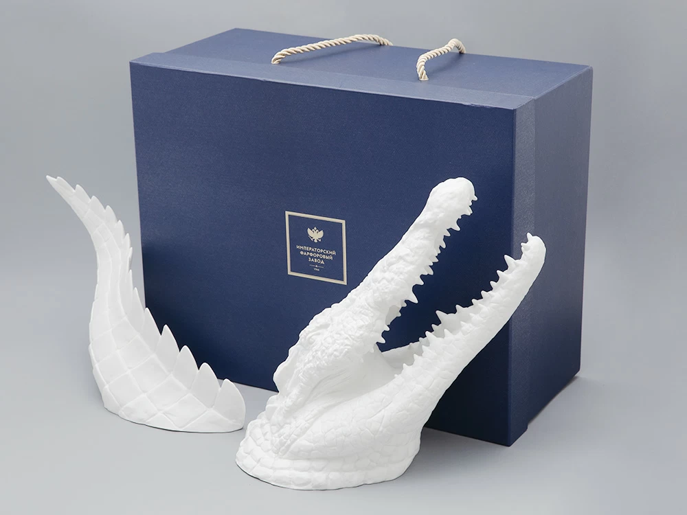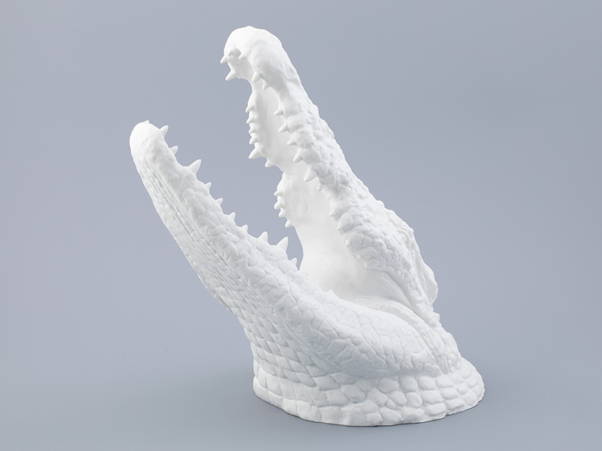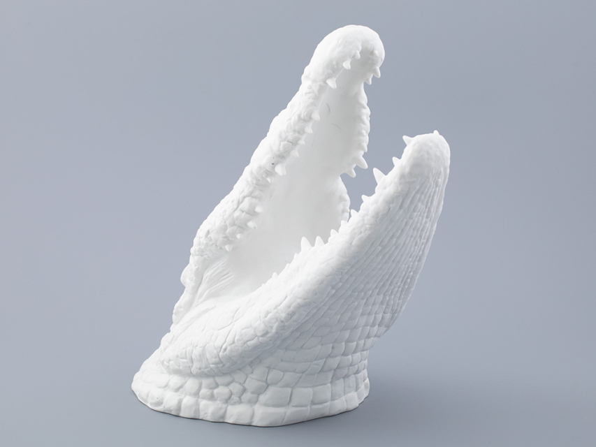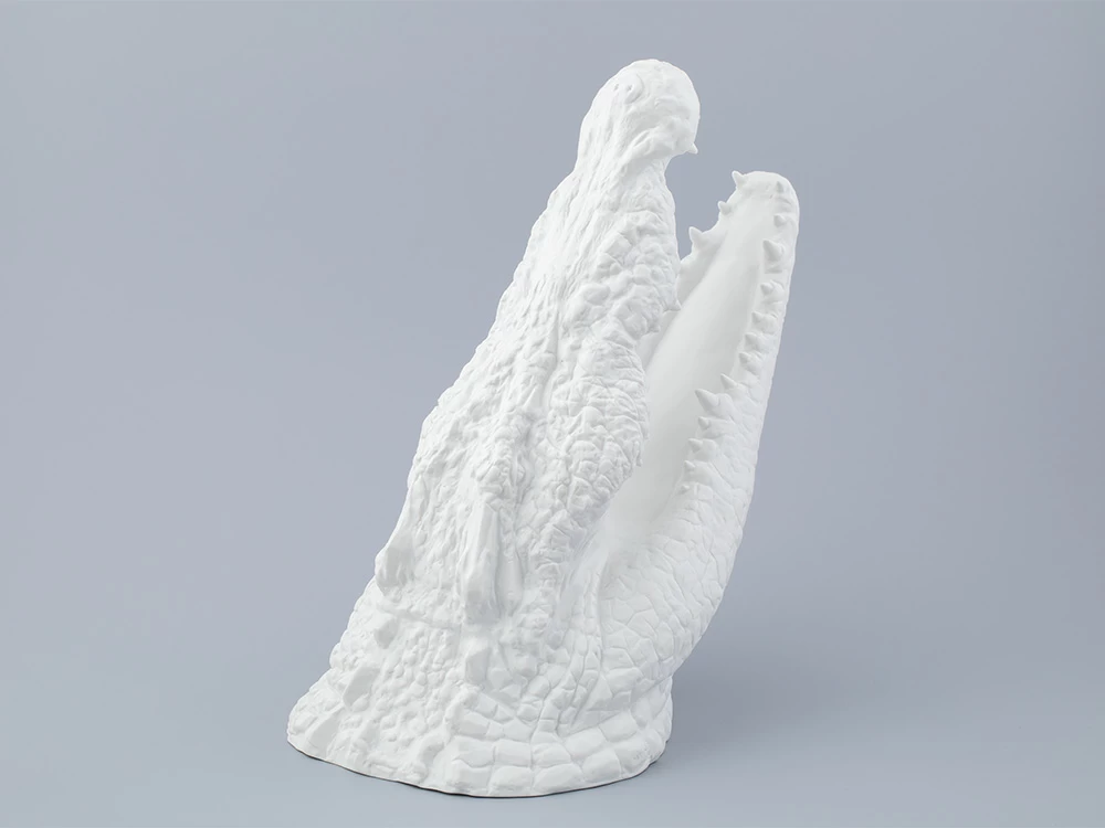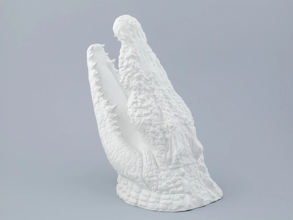 Скульптура «Крокодил» – эксклюзивный арт-объект от Галины Белаш. Скульптор уделяет большое внимание анатомии мощной рептилии, тщательно прорабатывает мельчайшие детали: крупную приплюснутую морду с острыми зубами, толстую чешуйчатую кожу с гребнями. Скульптура выполнена в бисквите – белый матовый фарфор проводит необходимую грань, сдерживая слишком реалистичное впечатление от скульптуры. Он акцентирует внимание на том, что «Крокодил» в данной случае – именно арт-объект. Словно появившиеся над гладью воды голова и хвост крокодила создают эффектную иллюзию и побуждают игру воображения.