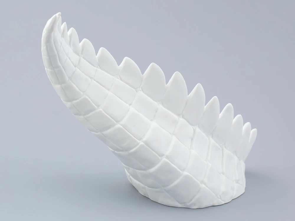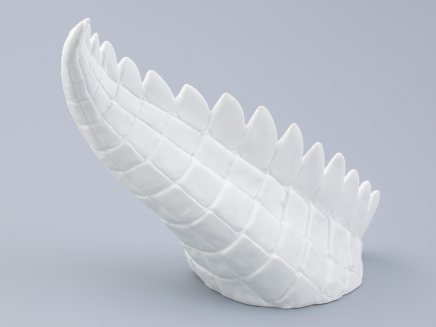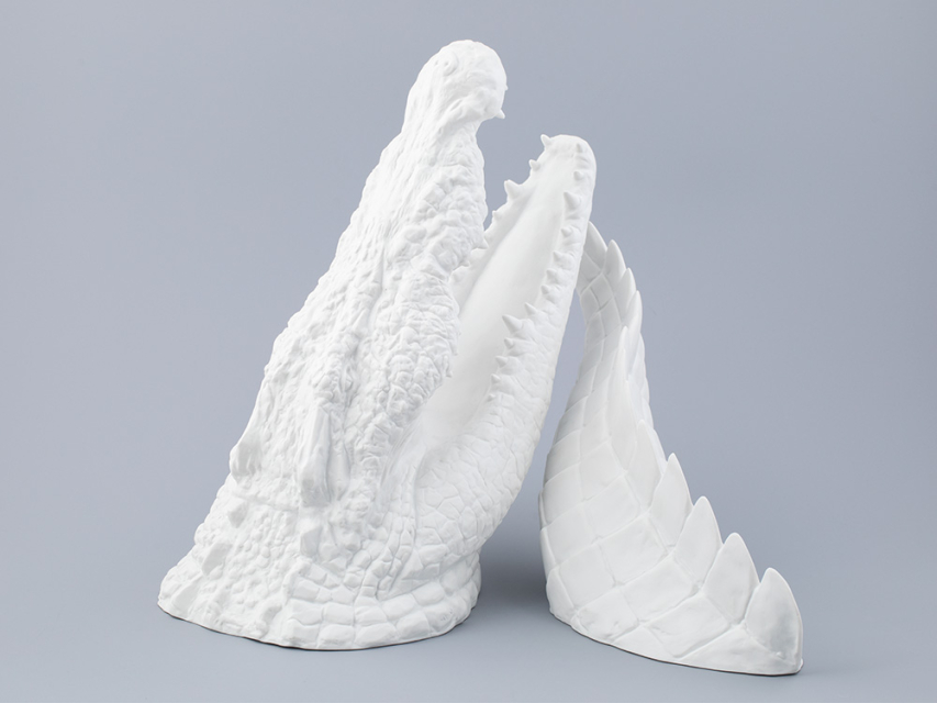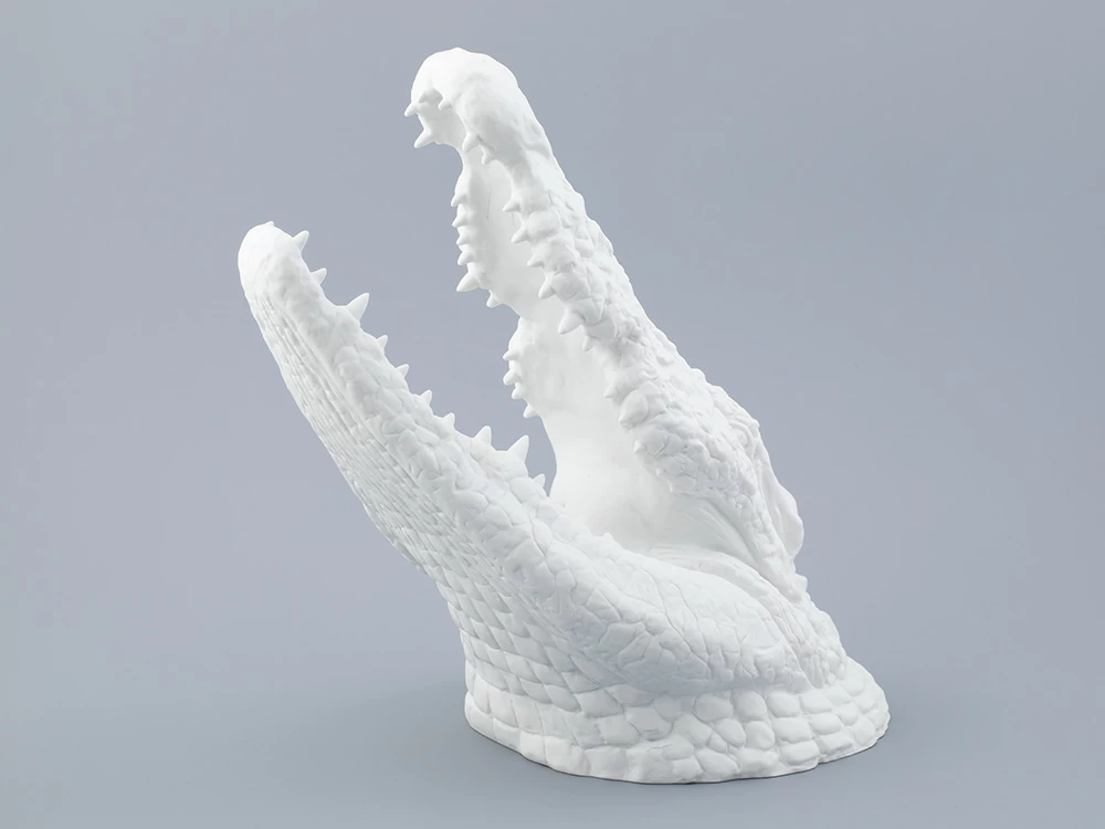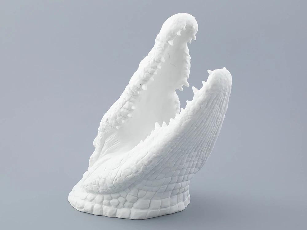 Скульптура «Крокодил» – эксклюзивный арт-объект от Галины Белаш. Скульптор уделяет большое внимание анатомии мощной рептилии, тщательно прорабатывает мельчайшие детали: крупную приплюснутую морду с острыми зубами, толстую чешуйчатую кожу с гребнями. Скульптура выполнена в бисквите – белый матовый фарфор проводит необходимую грань, сдерживая слишком реалистичное впечатление от скульптуры. Он акцентирует внимание на том, что «Крокодил» в данной случае – именно арт-объект. Словно появившиеся над гладью воды голова и хвост крокодила создают эффектную иллюзию и побуждают игру воображения.