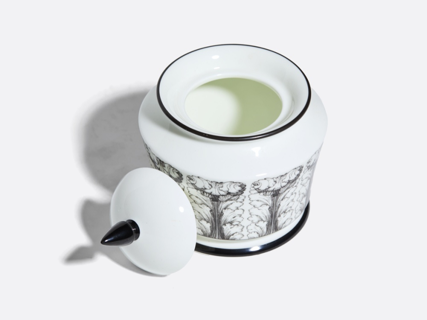 Светотень каждого изображения акцентирует рельефный декор деталей садового убранства. Гирлянды и розетки, листья тропического растения – аканта, декорирующие капители ордеров, выполнены в технике гравюры – они будто переместились с холодной архитектуры на тончайший костяной фарфор.
