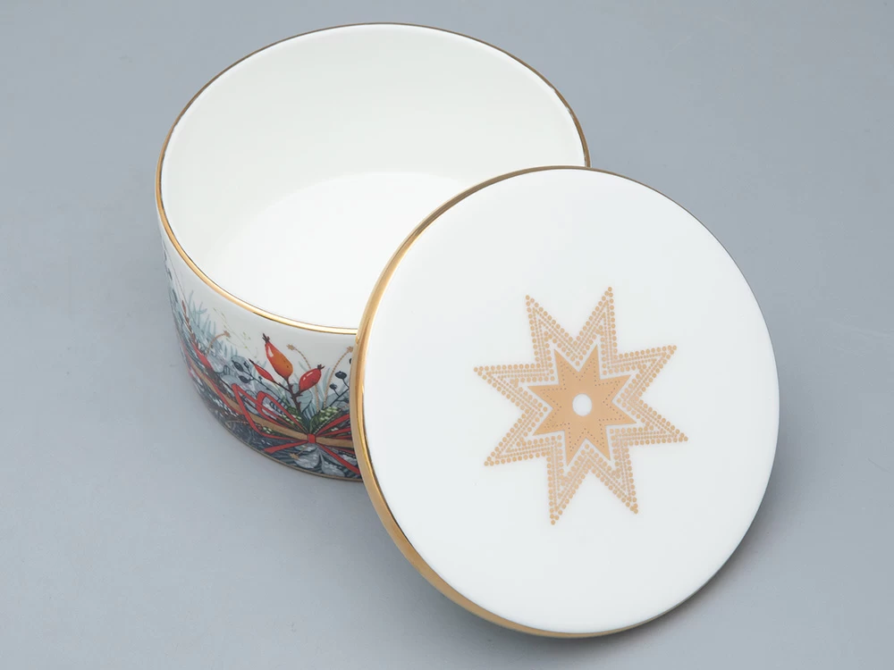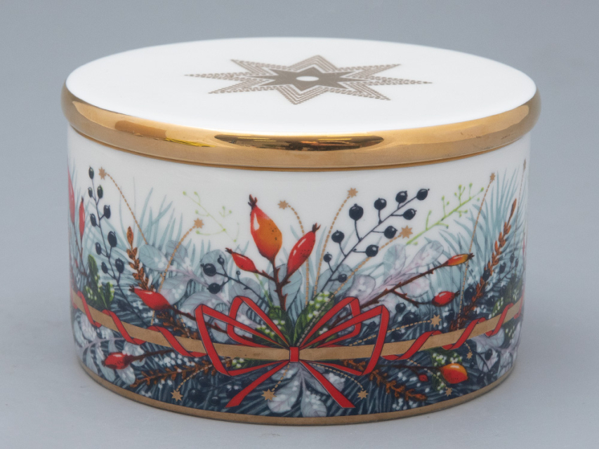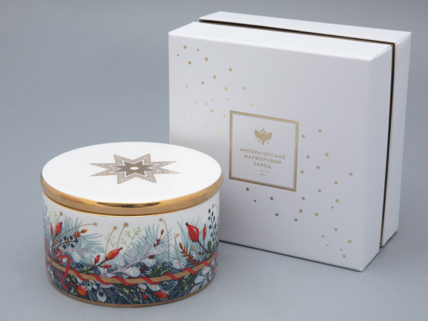 Шкатулка «Календа» – продолжение одноименной популярной серии фарфора, новинка 2023 года. «Календа» – это изысканное сочетание традиций и современных трендов. При создании композиции художник Юлия Чистякова вдохновлялась традиционным праздничным декором – рождественским венком, а также обратилась к художественному наследию Императорского фарфорового завода.