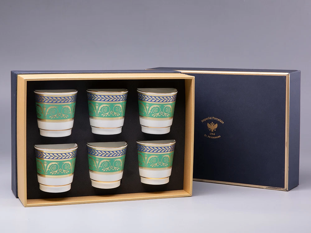 Стопка – традиционный аксессуар русского застолья. Набор стопок «Золотой» стал продолжением одноименной классической коллекция, которая включают в себя чайный, кофейный и столовый сервизы. Стопки станут органичным дополнением сервировки, а также могут использоваться самостоятельно. Их выразительный декор моментально притягивает к себе внимание. Роспись - растительная композиция - воссоздана по образцу сервиза первой половины XIX века из коллекции Государственного Эрмитажа.