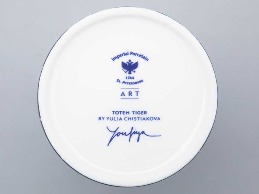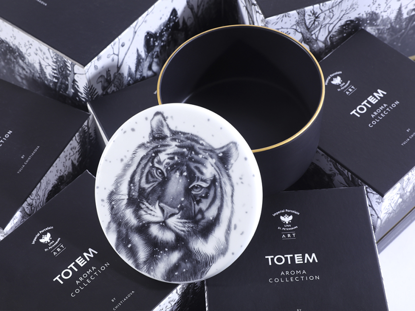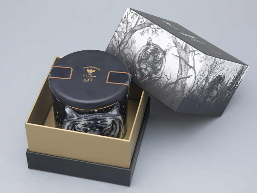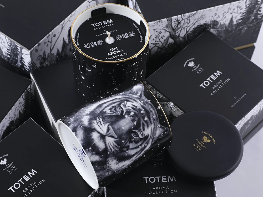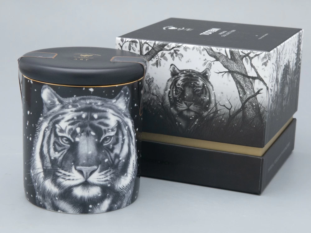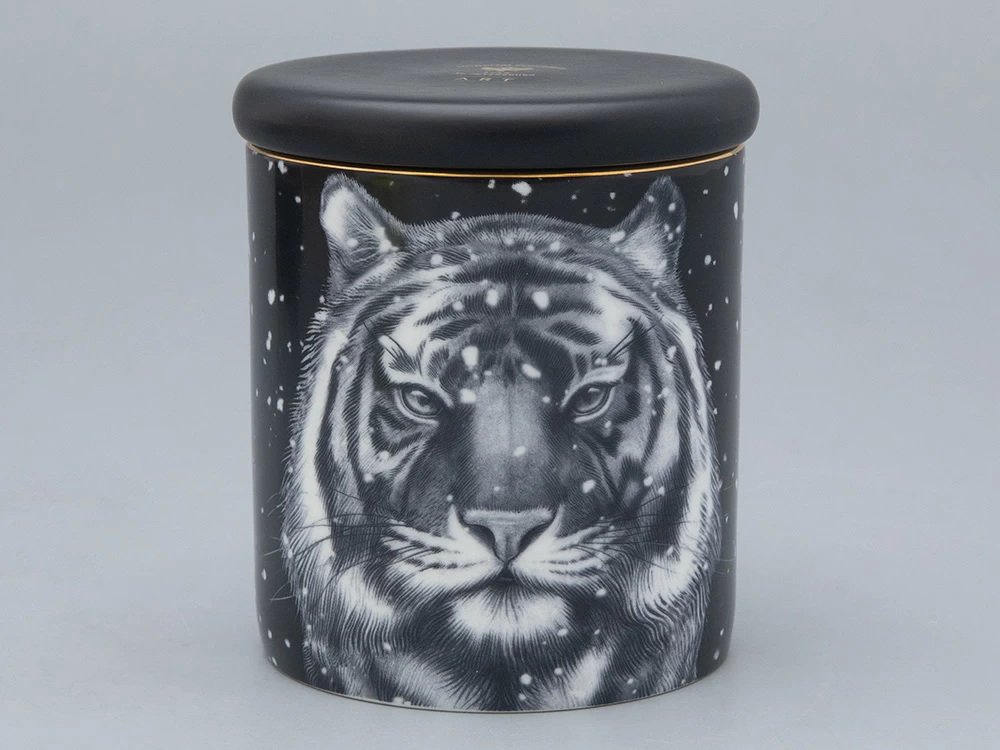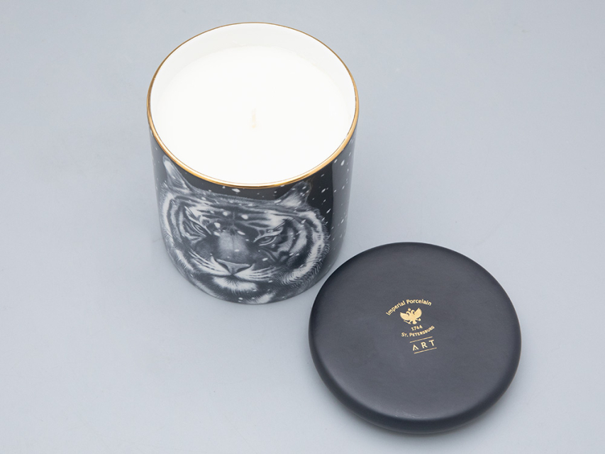 На фарфоре изображен тигр. Для многих народов этот могучий хищник является защитным символом и олицетворяет мужество и удачу. После того, как свеча закончится, фарфоровый стакан можно использовать заново: как посуду, для хранения всевозможных мелочей или вновь как подсвечник.