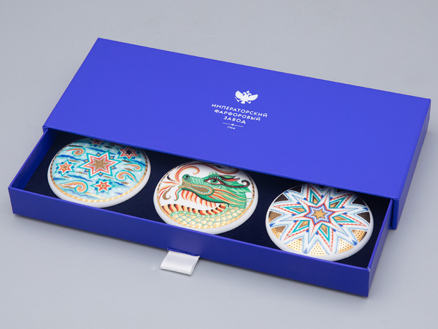 Новый год – время радости! Создадут атмосферу праздника и станут замечательным подарком эксклюзивная серия ёлочных украшений «Три стихии», посвященная символу наступающего года - Дракону. Игрушки представлены набором из трех елочных украшений. Благодаря упаковке изделия удобно хранить. Высокое качество подарочной упаковки делает набор замечательным подарком для родных, друзей и коллег.
