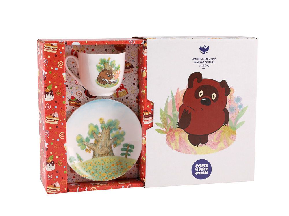 Декор чашки с блюдцем "Винни - Пух" и "Пятачок" разработан дизайнерами Императорского фарфорового завода в сотрудничестве с киностудией «Союзмультфильм».