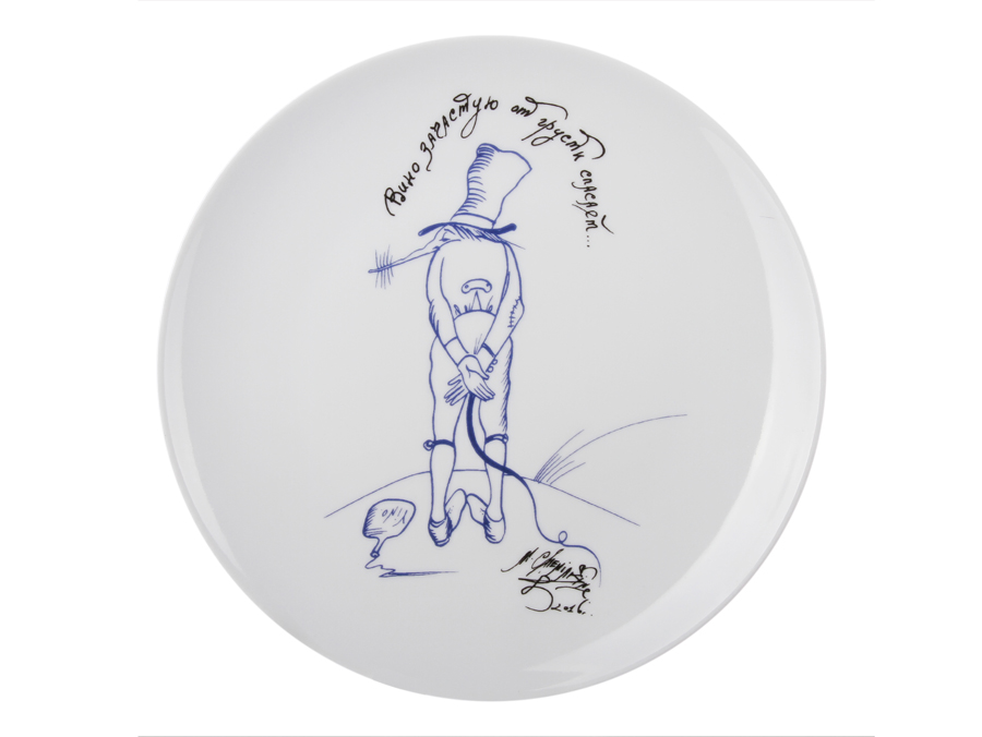 Серия из шести декоративных тарелок с графическими изображениями персонажей, характерных для творчества Михаила Шемякина. Талантливо и оригинально использует художник причудливые силуэты, неожиданные ракурсы, гротескные ситуации. В этой серии Шемякин выступает еще и в роли мастера афористики, используя меткие запоминающиеся фразы, каждая из которых – посвящение: Коммерсанту, Заядлому курильщику, Любителю вина, Кавалеру, Честному труженику, Победителю.