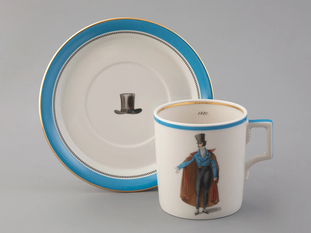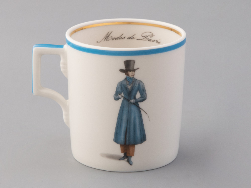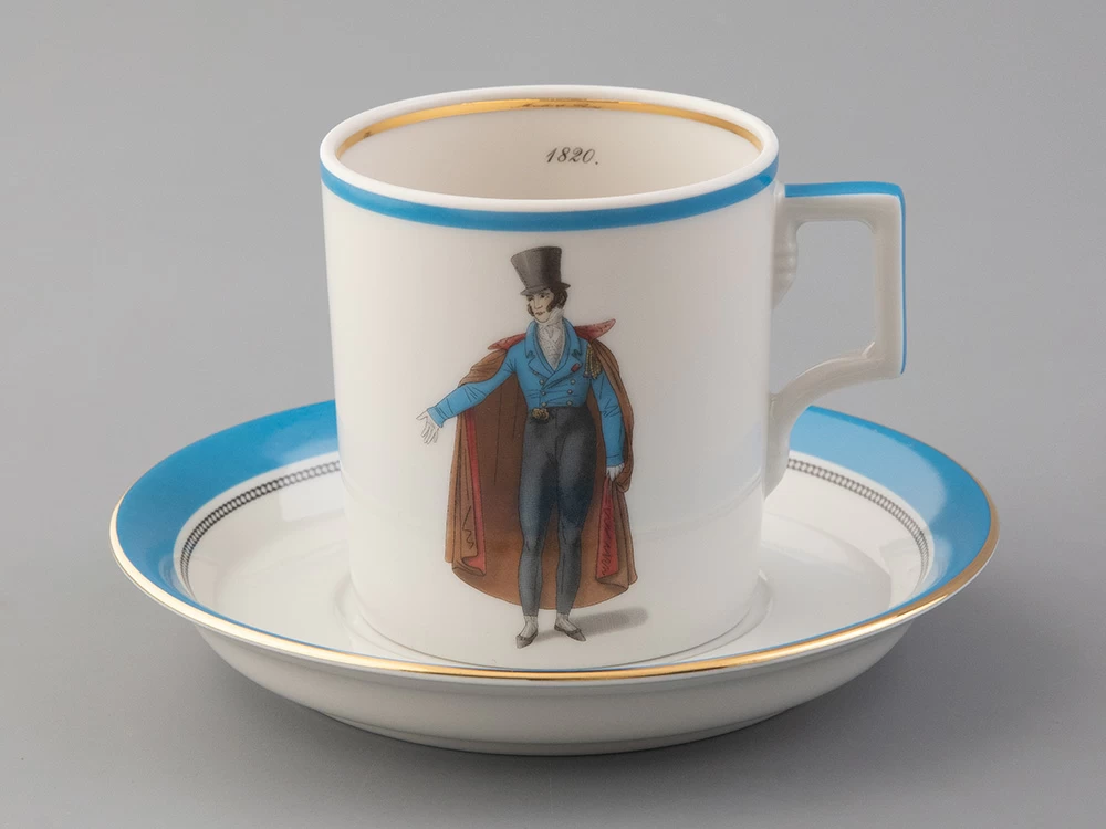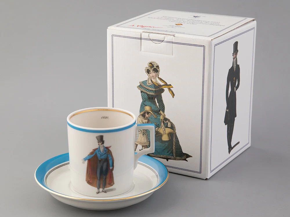 Чайная чашка с блюдцем «Modes de Paris 1820» на форме «Гербовая» из коллекции «Денди», созданной в рамках совместного проекта с известным историком моды - Александром Васильевым.