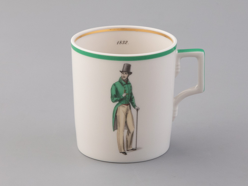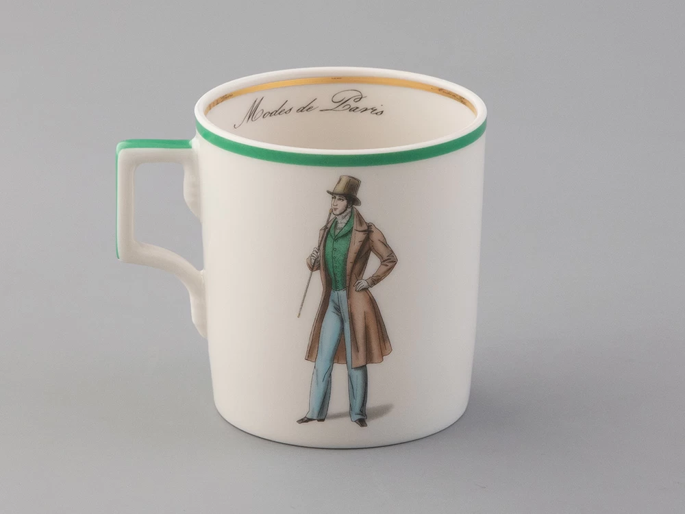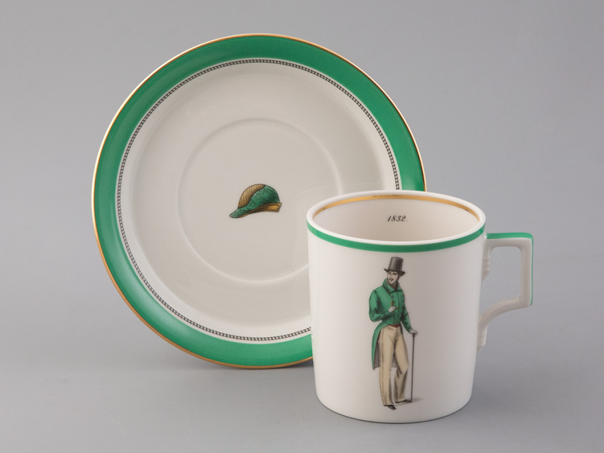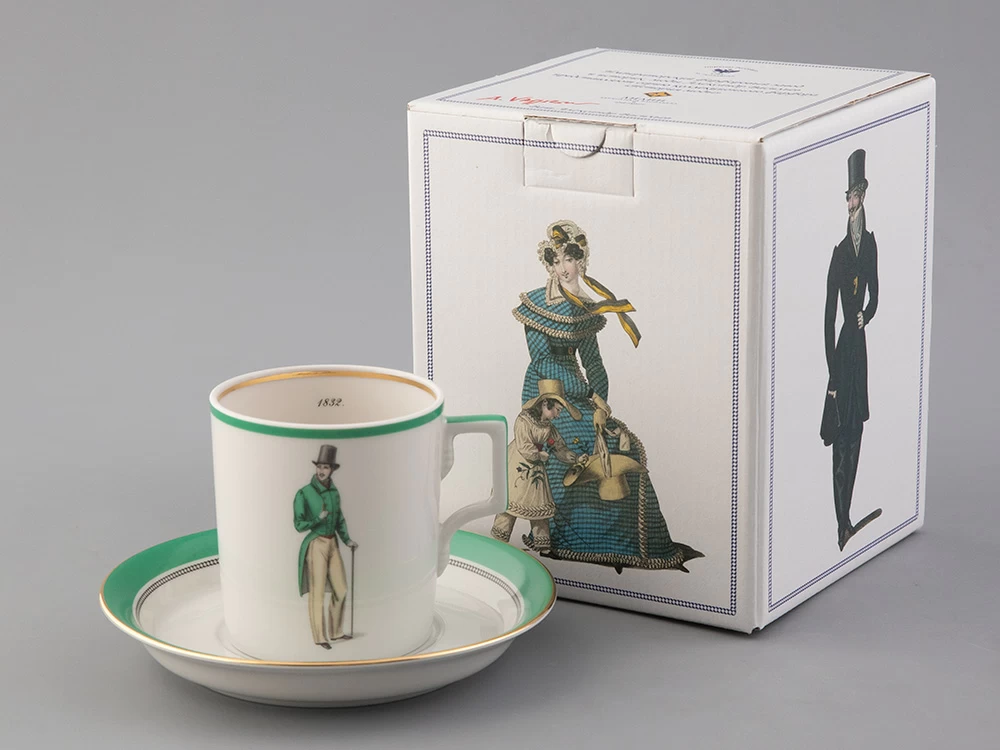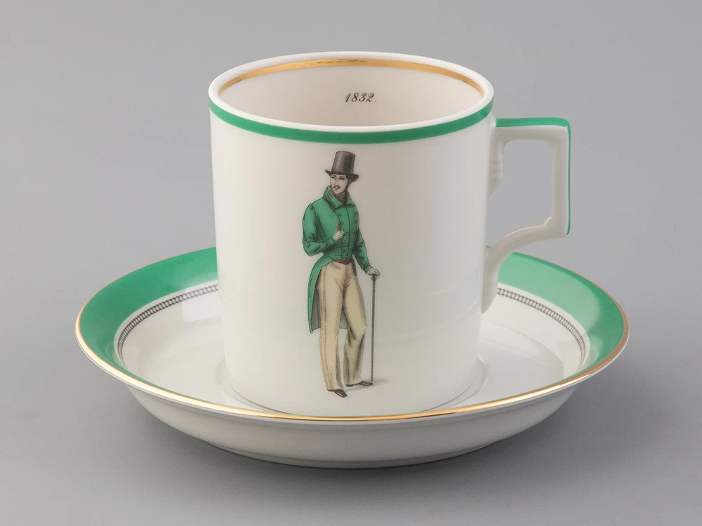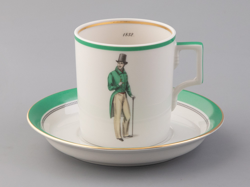 Чайная чашка с блюдцем «Modes de Paris 1832» на форме «Гербовая» из коллекции «Денди», созданной в рамках совместного проекта с известным историком моды - Александром Васильевым.