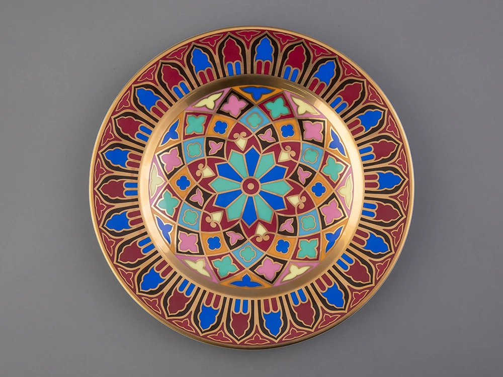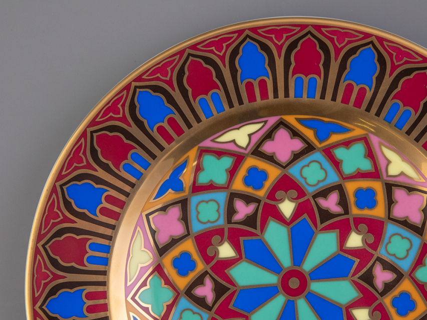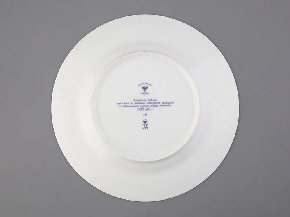 Тарелка декоративная рис. Готическая изготовлена на Императорском фарфоровом заводе из твердого фарфора с элементами ручной росписи. Рисунок восстановлен по музейному образцу. Диаметр изделия - 270 мм. Изделие продается в красивой подарочной упаковке. Серия из 57 тарелок была изготовлена на Императорском фарфоровом заводе специально для Петергофского дворца «Коттедж», построенного архитектором А. Менеласом; для супруги Николая I - Императрицы Александры Федоровны. Десертные тарелки были воссозданы на Императорском фарфоровом заводе. В основу декора тарелок положен узор в виде роз средневековых витражей. В декоре использованы красные, синие и зеленые классические тона. Тарелки богато декорированы натуральным золотом.