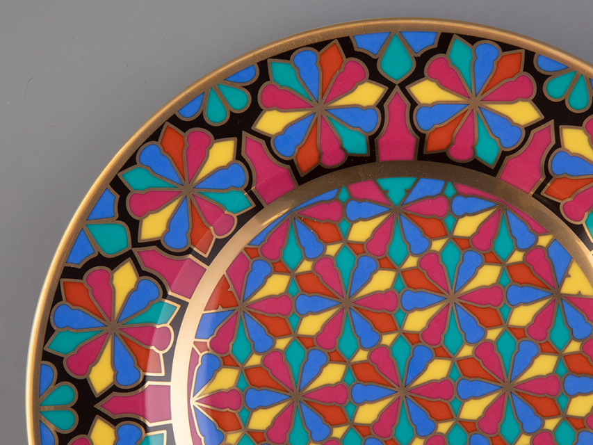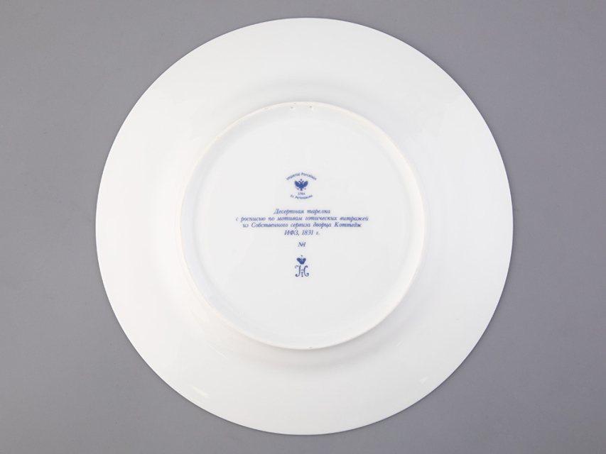Тарелка декоративная рис. Готическая изготовлена на Императорском фарфоровом заводе из твердого фарфора с элементами ручной росписи. Рисунок восстановлен по музейному образцу. Диаметр изделия - 270 мм. Изделие продается в красивой подарочной упаковке. Серия из 57 тарелок была изготовлена на Императорском фарфоровом заводе специально для Петергофского дворца «Коттедж», построенного архитектором А. Менеласом; для супруги Николая I - Императрицы Александры Федоровны. Десертные тарелки были воссозданы на Императорском фарфоровом заводе. В основу декора тарелок положен узор в виде роз средневековых витражей. В декоре использованы красные, синие и зеленые классические тона. Тарелки богато декорированы натуральным золотом.