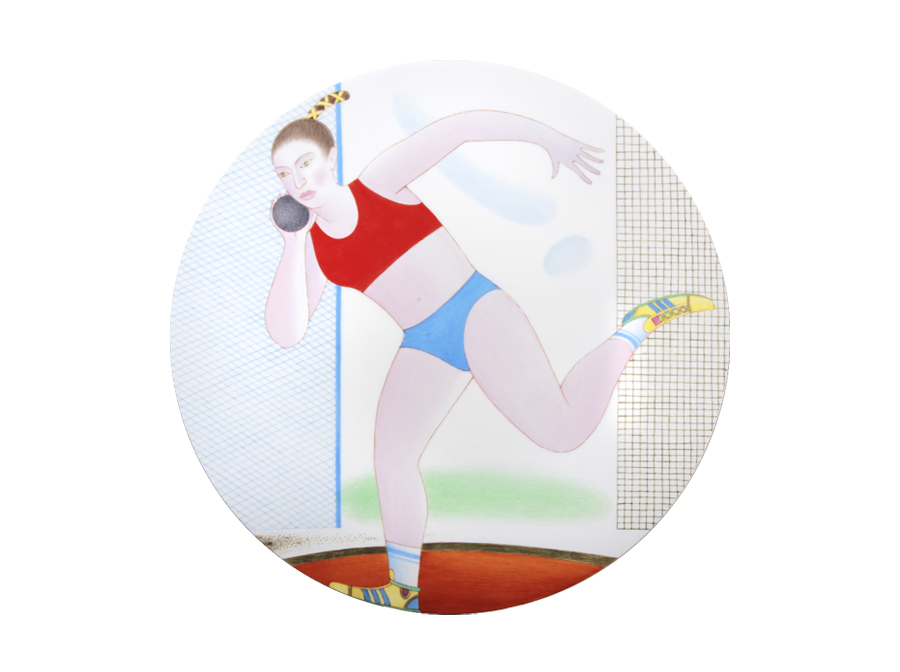 Метательница ядра изображена в момент абсолютного сосредоточения своих сил и возможностей. Сергею Соколову, автору серии, удается так умело вписывать фигуры в плоскость тарелки, что, например, в этом произведении статичная, замершая фигура спортсменки кажется объемной, динамичной, воплощающей готовность к мощному победному броску.