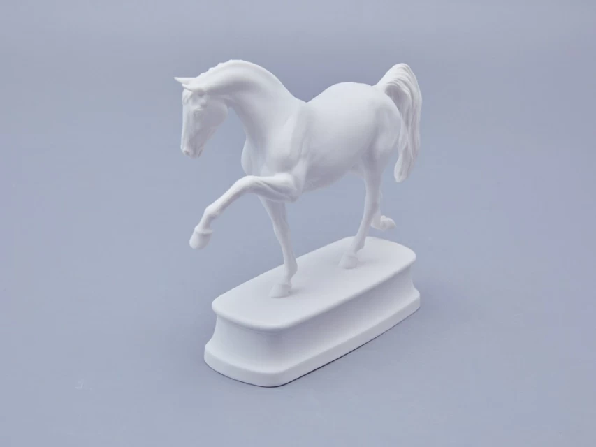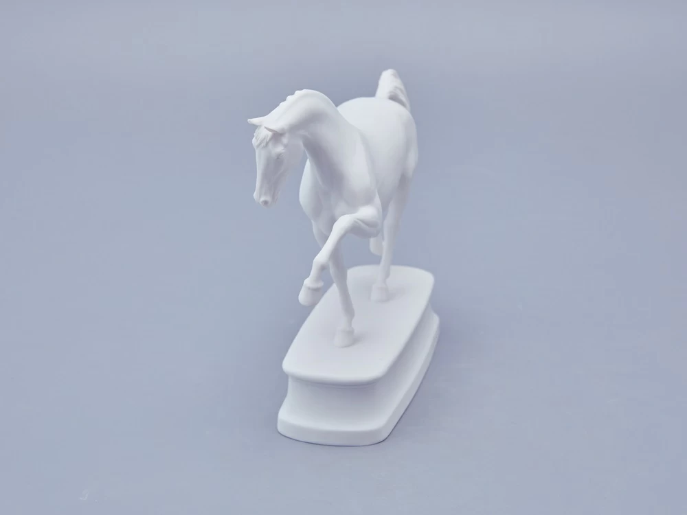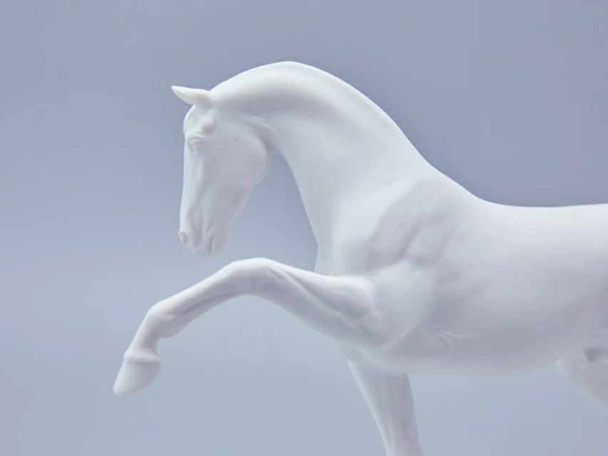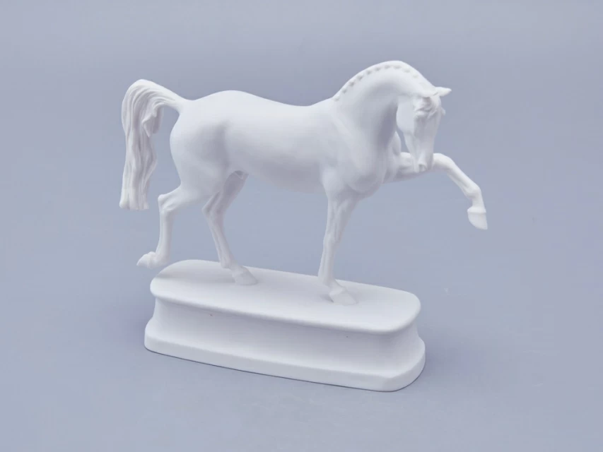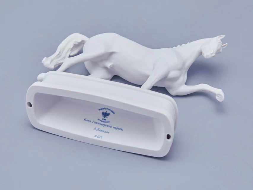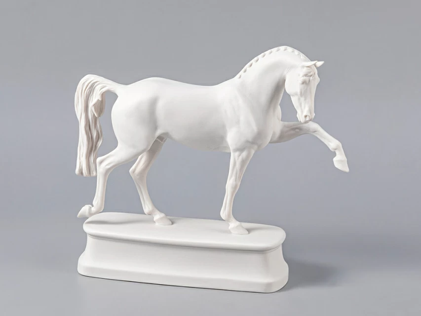 Автор произведения продолжает в этой серии традиции создания высокохудожественной анималистической скульптуры из фарфора, демонстрируя выдающееся мастерство и внимание к деталям. Изящная фарфоровая лошадь выполнена с невероятной точностью: белоснежная фигура обладает тончайшей прорисовкой, где видна каждая складка кожи, вздувшаяся в движении вена и напряженная мышца. Складывается ощущение, что животное живое и вот-вот сойдет со своего изящного постамента.