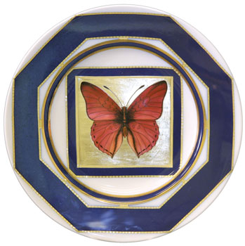 Коллекция «Бабочки» представляет композицию из 32 декоративных тарелок со стилизованным изображением бабочек различных видов. Серия развивает традиционную для фарфора тему «ботанических» сервизов, когда в XVIII – XIX вв. подобные тарелки украшали десертные столы на дворцовых приемах. Работы художника отличает мастерски выполненная ручная уникальная роспись с использованием красок из драгоценных металлов. Сочный кобальт по абрису бортов усиливает декоративность центрального мотива, создавая образ яркой живописной картины в драгоценном обрамлении.
