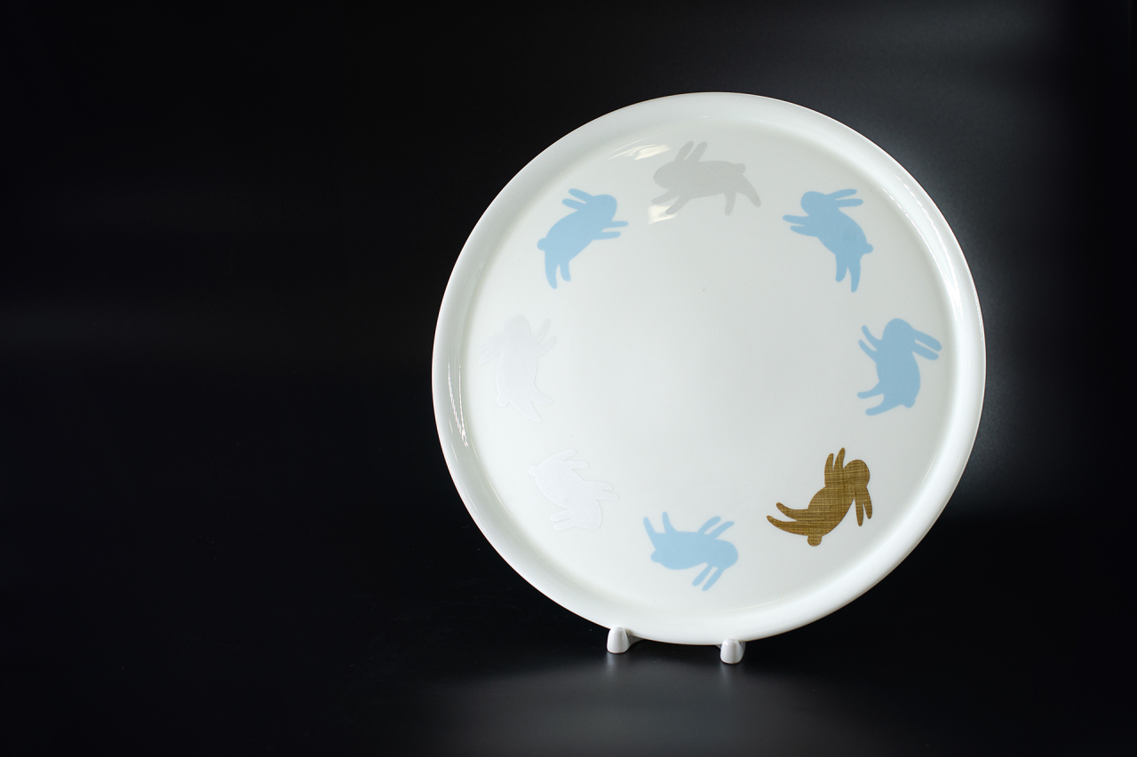 Декор на подносе воплощает собой гармонию природы и утонченности художественного мастерства. Белоснежный фон фарфора символизирует чистоту зимнего утра, когда природа укрыта мягким снежным покровом. На этой светлой глади располагаются стилизованные изображения зайчиков. Их мягкие, плавные формы передают легкость и грациозность животных, будто застигнутых врасплох первым солнечным лучом.
