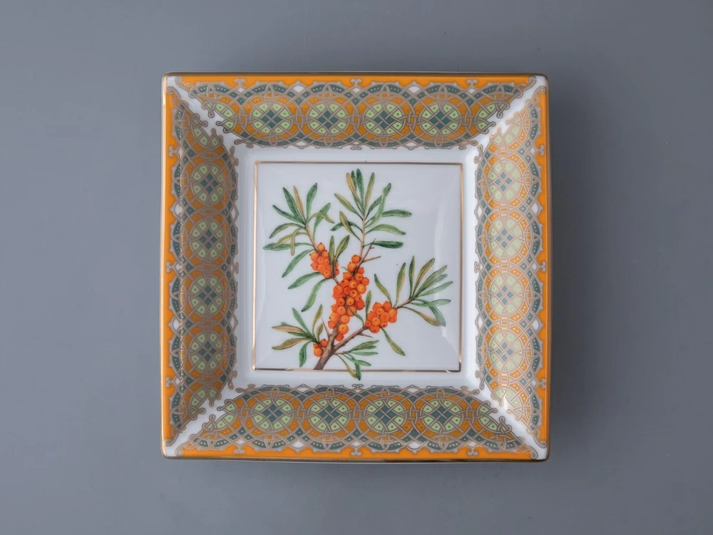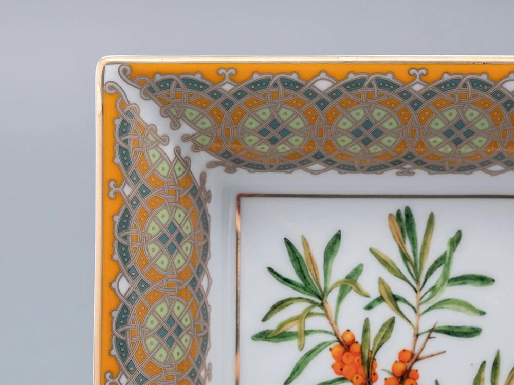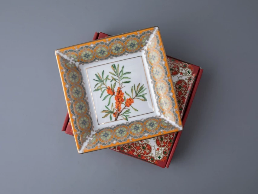 Подставка для мелочей «Облепиха сибирская» вошла в продолжение коллекции «Цветы и ягоды России» от художника Ольги Будашовой. В своих работах автор зачастую изображает цветы и дары природы, – такой декор остается вне времени. Используя растительные мотивы, Ольга Будашова создает предметы, которые сочетают в себе искусство и практичность. Композиция на фарфоре, выполненная в эстетике винтажных ботанических иллюстраций, дополнена орнаментальным узором – авторским размышлением на тему национальной вышивки.