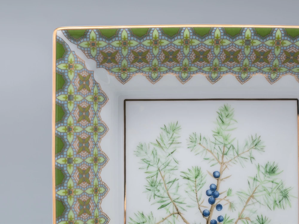 Подставка для мелочей «Можжевельник ароматный» вошла в продолжение коллекции «Цветы и ягоды России» от художника Ольги Будашовой. В своих работах автор зачастую изображает цветы и дары природы, – такой декор остается вне времени. Используя растительные мотивы, Ольга Будашова создает предметы, которые сочетают в себе искусство и практичность. Композиция на фарфоре, выполненная в эстетике винтажных ботанических иллюстраций, дополнена орнаментальным узором – авторским размышлением на тему национальной вышивки.