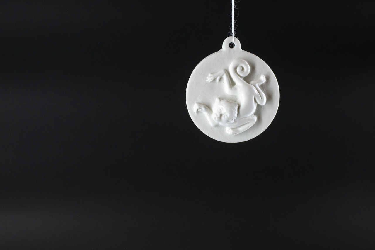 Авторская подвеска выполнена из костяного фарфора на Императорском фарфоровом заводе. Предмет входит в серию работ Знаки Зодиака