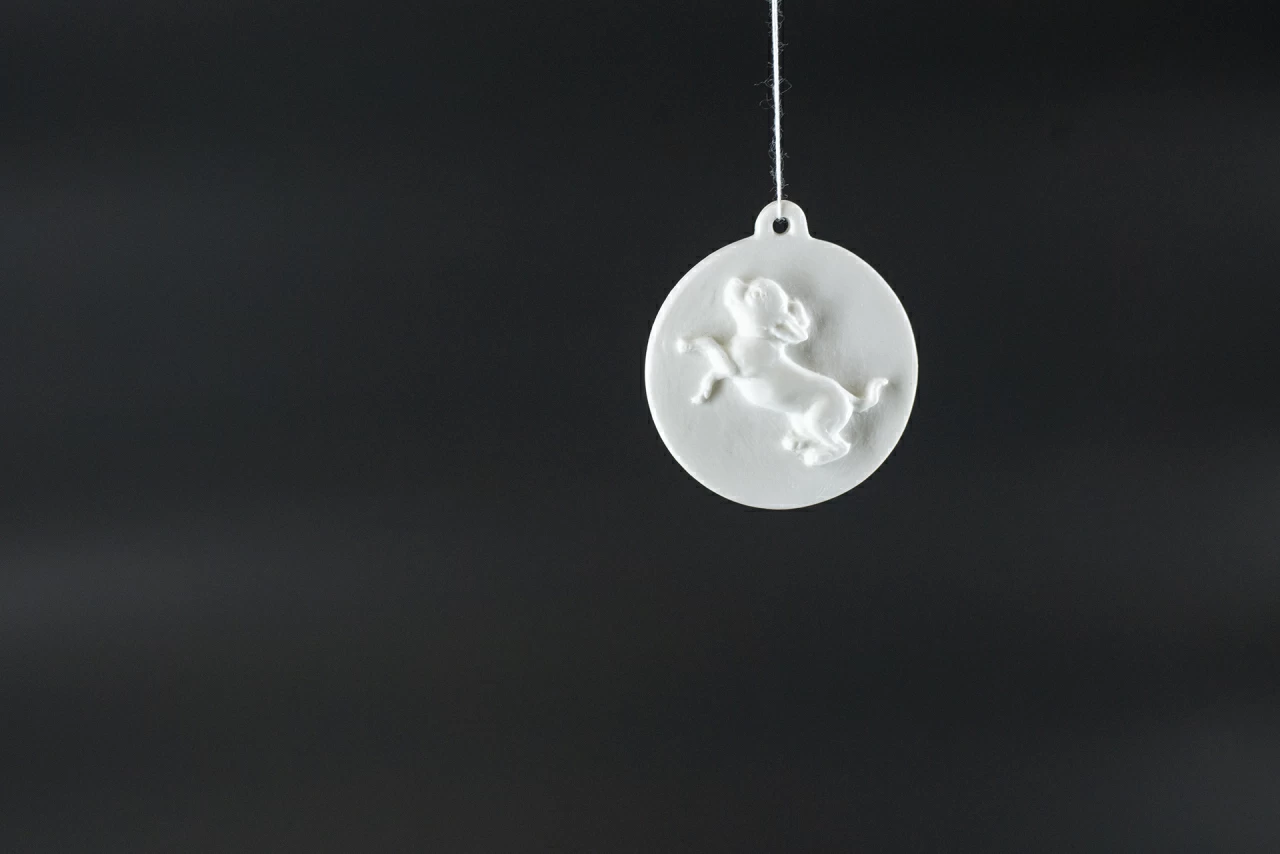 Авторская подвеска выполнена из костяного фарфора на Императорском фарфоровом заводе. Предмет входит в серию работ Знаки Зодиака
