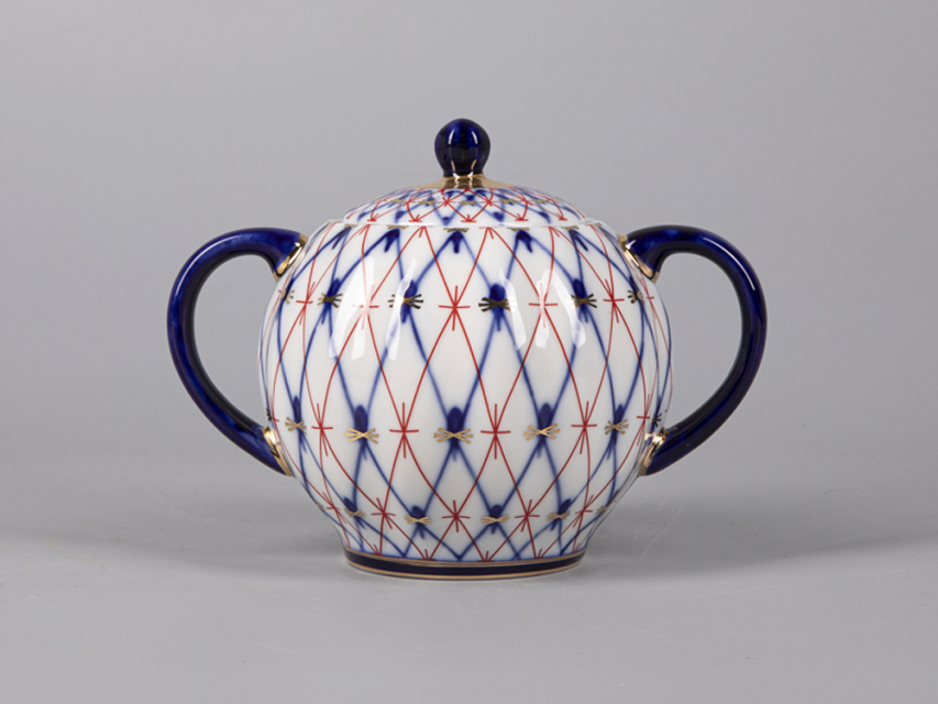 «Сетка 1950» – новый взгляд на один из шедевров великой Анны Яцкевич. Форма сахарницы «Тюльпан» расположила на себе ритмичный сетчатый орнамент. Простое и, одновременно, оригинальное решение составляют два контрастных классических цвета: красный и синий. Их сдержанный «диалог» по-новому обыгрывает спокойную дольчатую форму. Такой декор, дополненный золотыми акцентами и насыщенным кобальтом ручек, рождает стильный предмет на все времена.