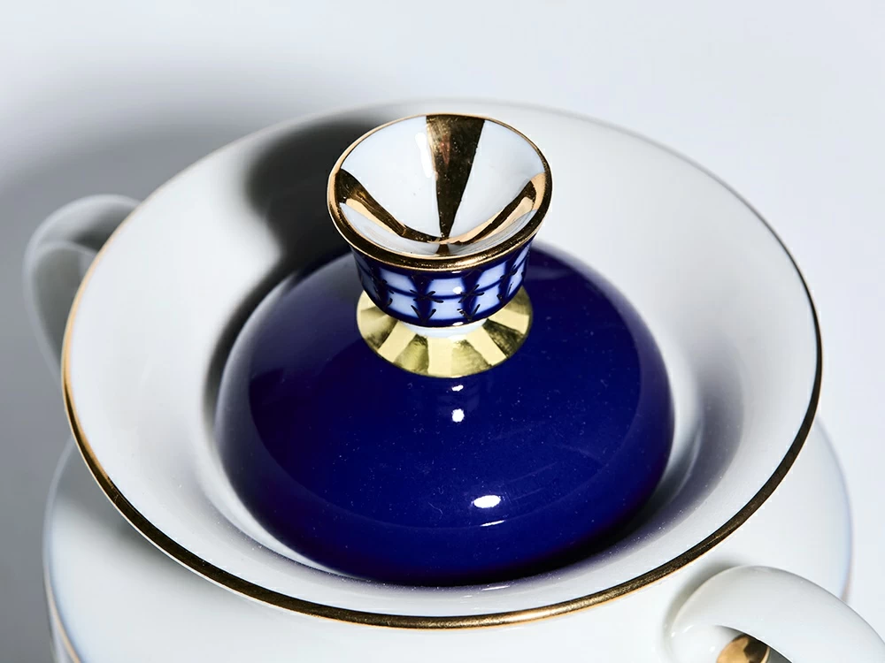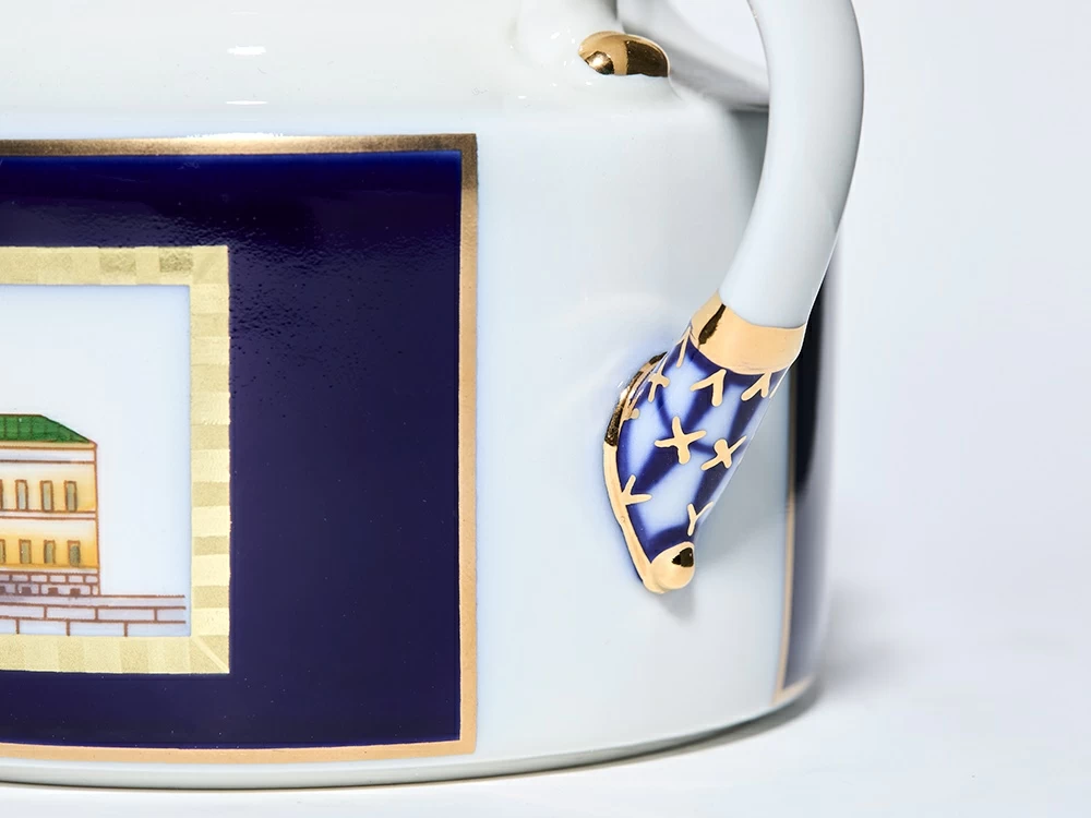 Роспись сервиза выполнена в технике подглазурной живописи кобальтовой краской, с последующей надглазурной живописью надглазурными красками и золотосодержащим препаратом с цировкойПо тулову всех полых предметов в кобальтовых с золотом рамках изображения известных исторических зданий, знаменитых архитекторов. На подставке под доливной чайник, на ручках, носиках, и на всех крышках клетчатый кобальтовый фриз и фриз из мелких золотых фестонов. Кистью вручную выполнена отводка золотосодержащим препаратом по краю всех изделий, по «ножке» чашки и вазы для конфет, зеркальцу блюдца и по марли тарелки, по краю и у основания держателей крышек; роспись ручек и носиков всех предметов сервиза, «ножек» подставки под доливной чайник.