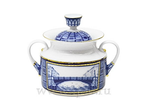Сахарница рис. Мосты Санкт-Петербурга изготовлена на Императорском фарфоровом заводе из твердого фарфора с элементами ручной росписи. Автор рисунка - Шуляк Г.Д. Объем изделия - 540 мл.