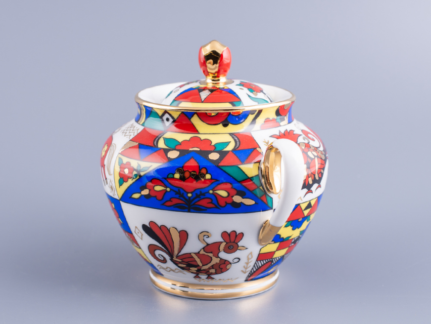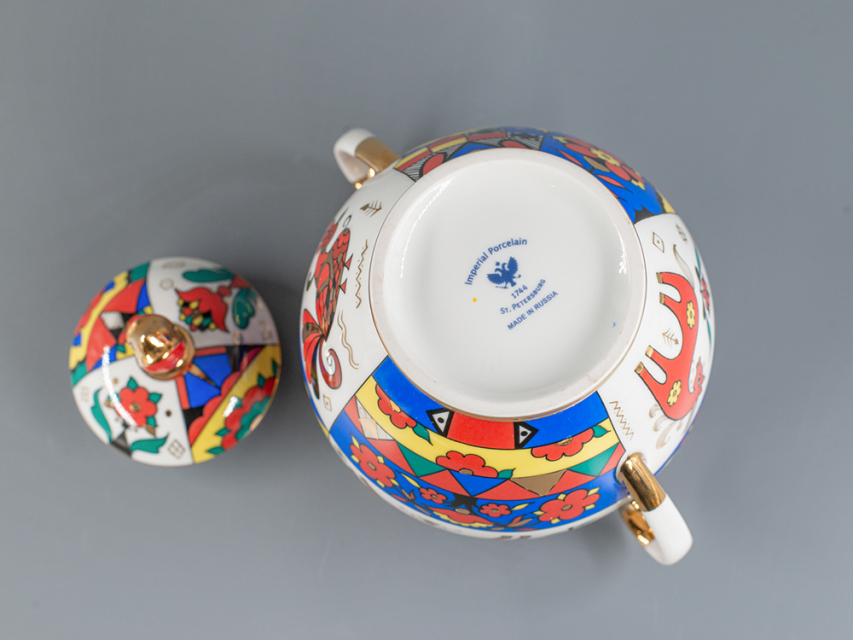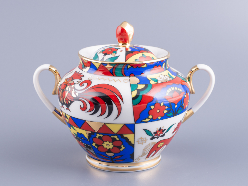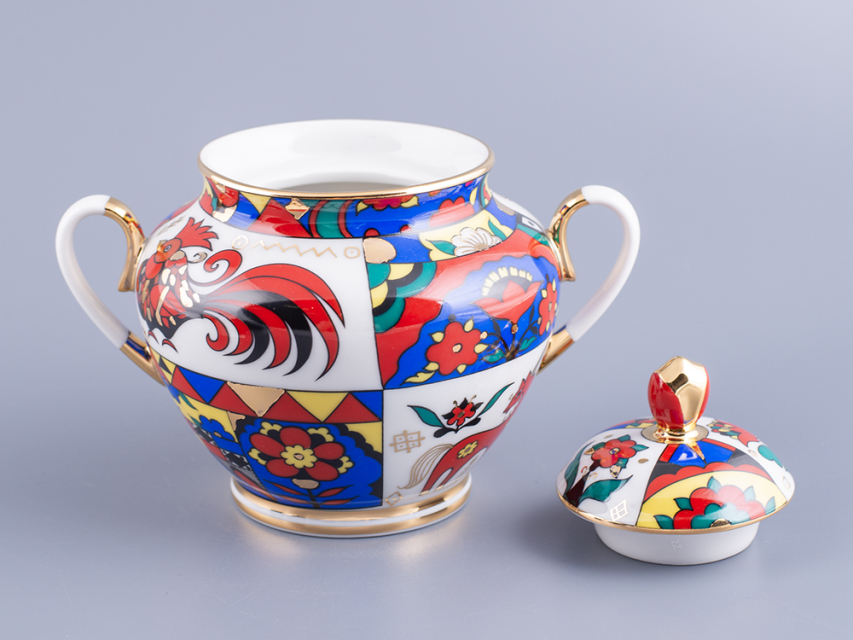 Роспись выполнена в технике надглазурной живописи надглазурными красками и золотосодержащим препаратом. Поверхность предмета разделена на прямоугольники, в которых чередуются изображения фантастических животных и птиц с орнаментом из растительных и геометрических элементов. Кистью вручную нанесена отводка золотосодержащим препаратом по краю всех изделий, лента золотом по ножке всех предметов, в месте соединения держателей крышек.