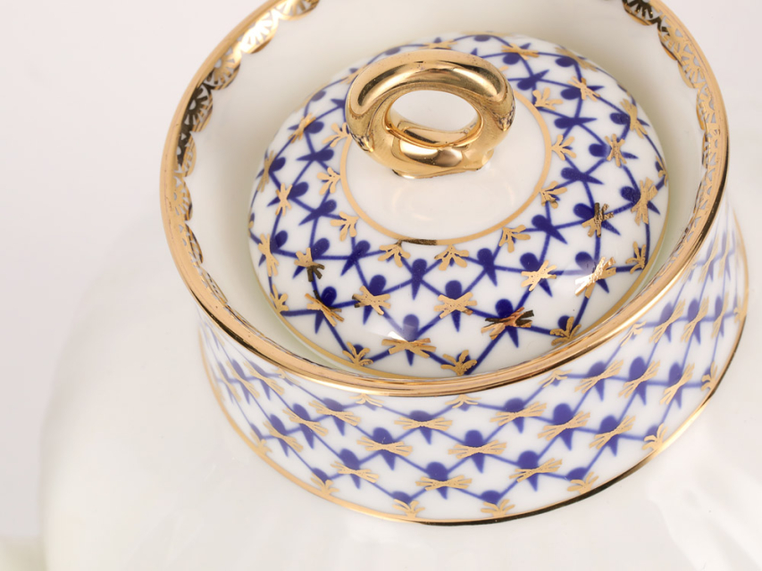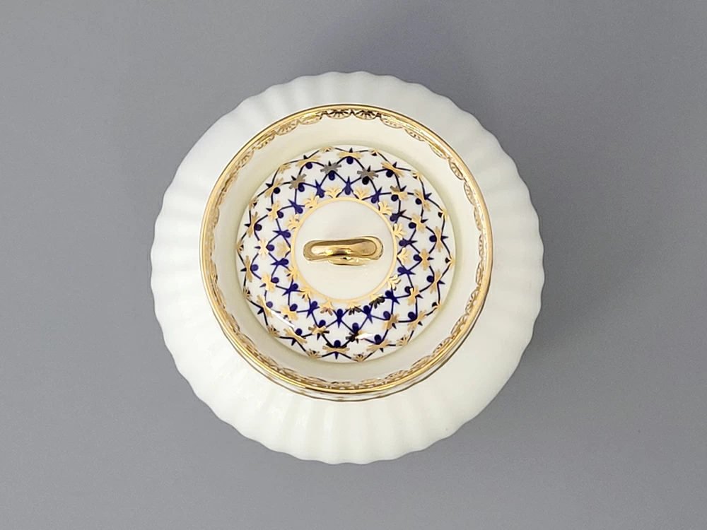Сахарница рис. Кобальтовая сетка изготовлена на Императорском фарфоровом заводе из костяного фарфора с элементами ручной росписи. Автор рисунка - Яцкевич А.А. Объем изделия - 390 мл.