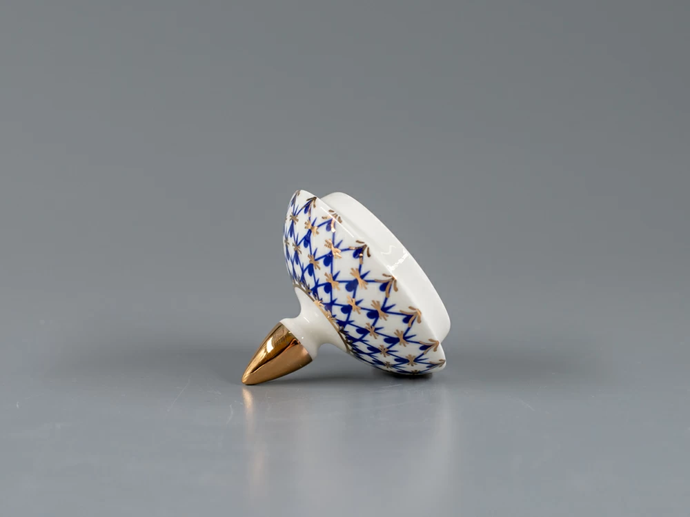 Роспись выполнена в технике подглазурной живописи кобальтовыми красками с последующей ручной доделкой золотосодержащим препаратом. По тулову всех предметов, по борту блюдец и на крышках от сахарницы и кофейника в сплошном заполнении сетчатый кобальтовый фриз и по нему фриз из мелких золотых «жучков». Кистью вручную нанесены отводки золотосодержащим препаратом по верхнему краю рисунка, по краю и по ножке предметов (на кофейнике, сливочнике, чашке, сахарнице), по краю блюдца, а так же по носику кофейника и на держателях крышек.