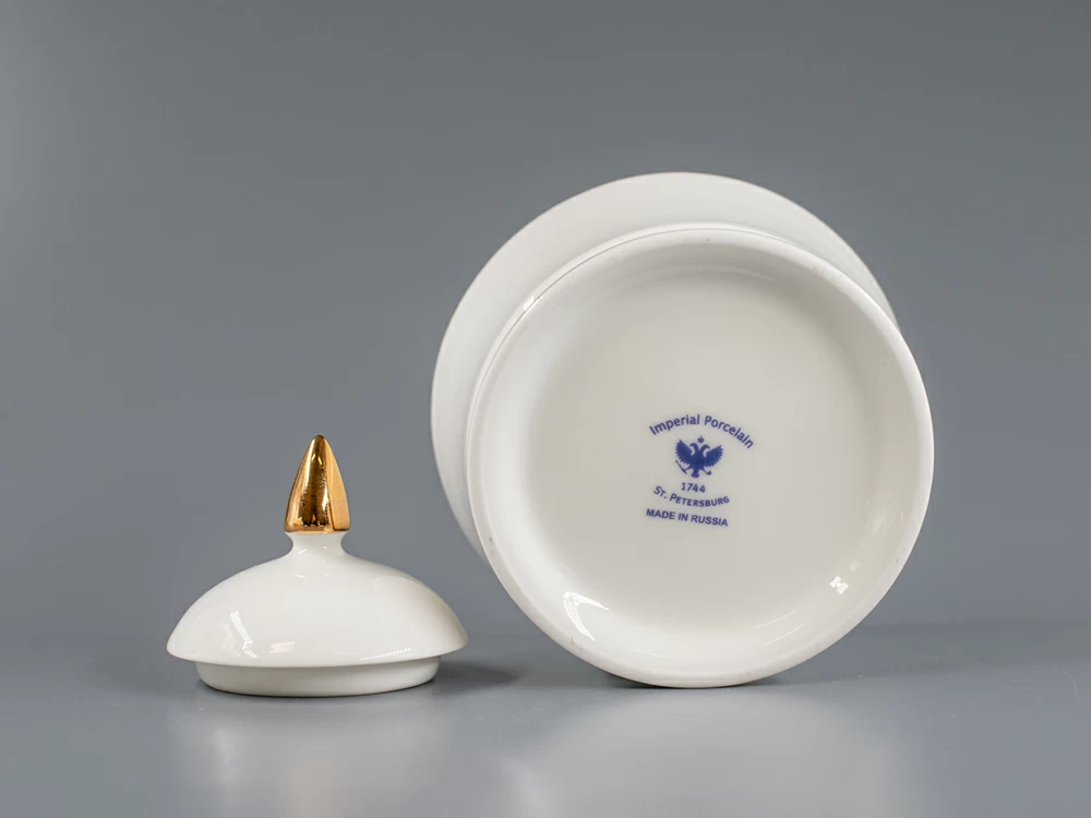 Сахарница "Золотая лента" на форме "Юлия" изготовлена на Императорском фарфоровом заводе из костяного фарфора. Форма отливается вручную. Для декорирования используется отводка золотом.