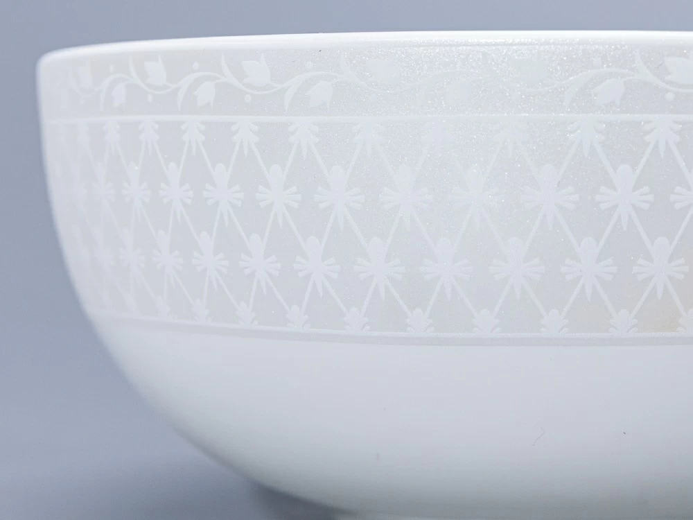Универсальный салатник из коллекции «Жемчужная сетка» – это новое прочтение классического узора «кобальтовая сетка», ставшего визитной карточкой Императорского фарфорового завода. Дизайн строится на изящном контрасте фактур: благородную матовую поверхность украшает рельефный орнамент. Мягкое сияние перламутра и лаконичные линии формы «Идиллия» подчеркивают изящество костяного фарфора, наполняя интерьер светом и аристократизмом.