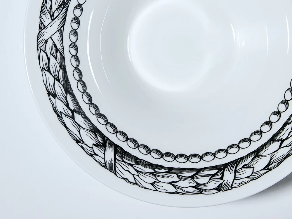 На благородной поверхности предметов запечатлены элементы усадебной архитектуры: изящные гирлянды и розетки, листья аканта и капители ордеров, которые гармонично переместились с архитектурных сооружений на тончайший костяной фарфор. Техника гравюры рождает тонкую игру света и тени, подчеркивая изящество рельефного декора.