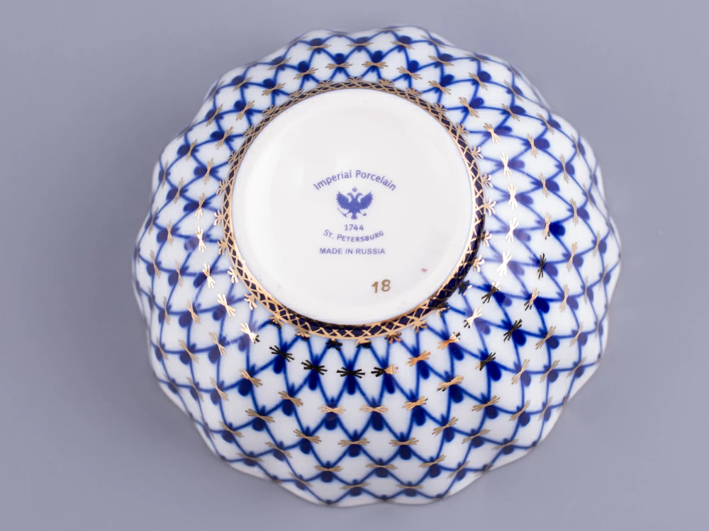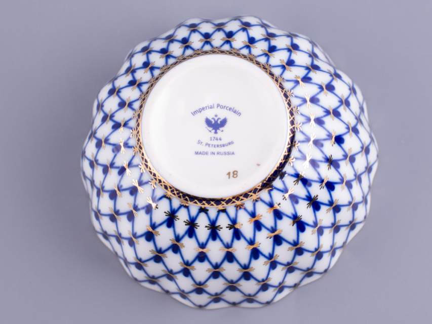 Салатник, рисунок Кобальтовая сетка, изготовлен на Императорском фарфоровом заводе из твердого фарфора с элементами ручной росписи. Автор рисунка - Яцкевич А.А. Объем изделия - 385 мл.