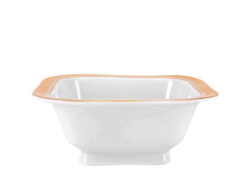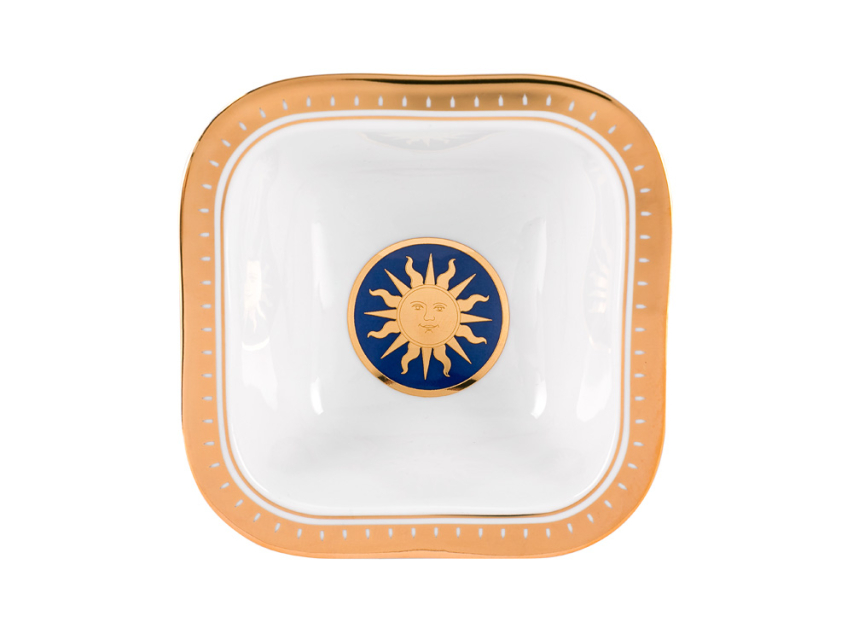 Салатник изготовлен на Императорском фарфоровом заводе из твердого фарфора. Для декорирования используется надглазурная деколь, роспись золотом.