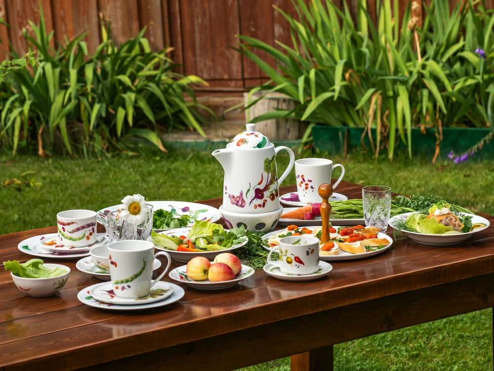 Коллекция фарфора «Мамина дача» вдохновлена теплотой летних дней, свежестью вкуснейших овощей с собственного огорода и уютом загородной жизни.