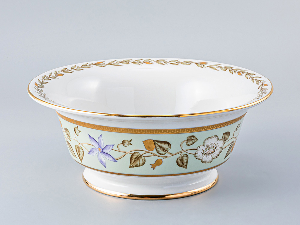 Остальные предметы сервиза изготовлены методом литья с последующим глазурованием и двукратным высокотемпературным обжигом. По тулову специй и салатников, а также по поверхности тарелки ?265 и блюда д/торта широкая нефритовая лента, обрамленная золотыми отводками и росписью горизонтальной ветки с белыми и розовыми цветами. По поверхности тарелок ?220, 225 мм и по внутренней поверхности салатников - гирлянда из золотых листьев в обрамлении двух отводок золотом.