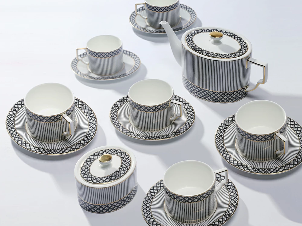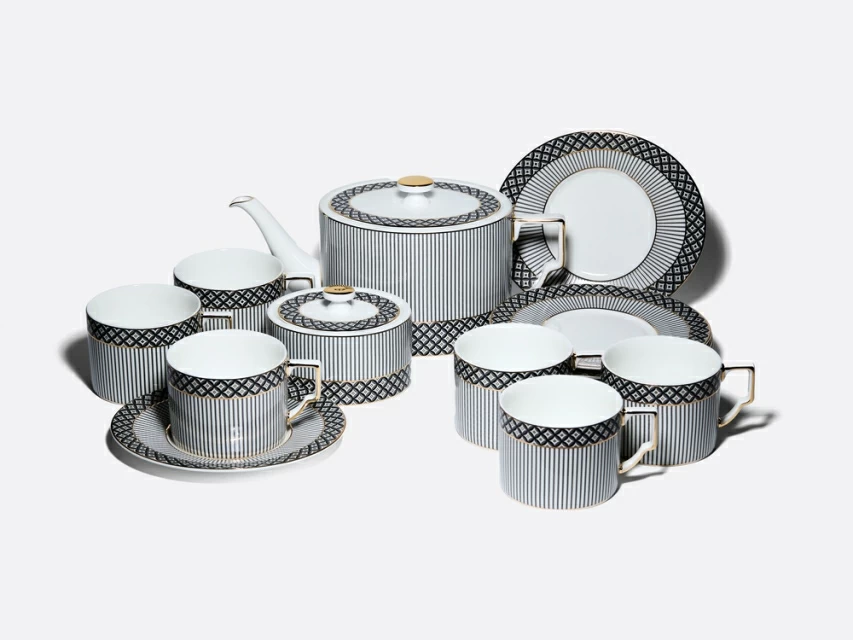 Чайный сервиз из коллекции «Elegant» на 6 персон включает 14 предметов: чайник, сахарницу и 6 чайных пар. В коллекции соединяются традиции петербургского фарфора и современного искусства. Предметы исполнены на форме «Элегия» заслуженного художника РФ Татьяны Афанасьевой. Строгая геометрия и гармония пропорций стала основой для дизайна художницы Любови Цветковой. Она соединила готический орнамент масверк с динамикой оп-арта, создав оптические иллюзии движения и объёма. Этот союз утончённой формы и оригинального декора станет изысканным акцентом интерьера, наполняя эстетикой чайную церемонию.