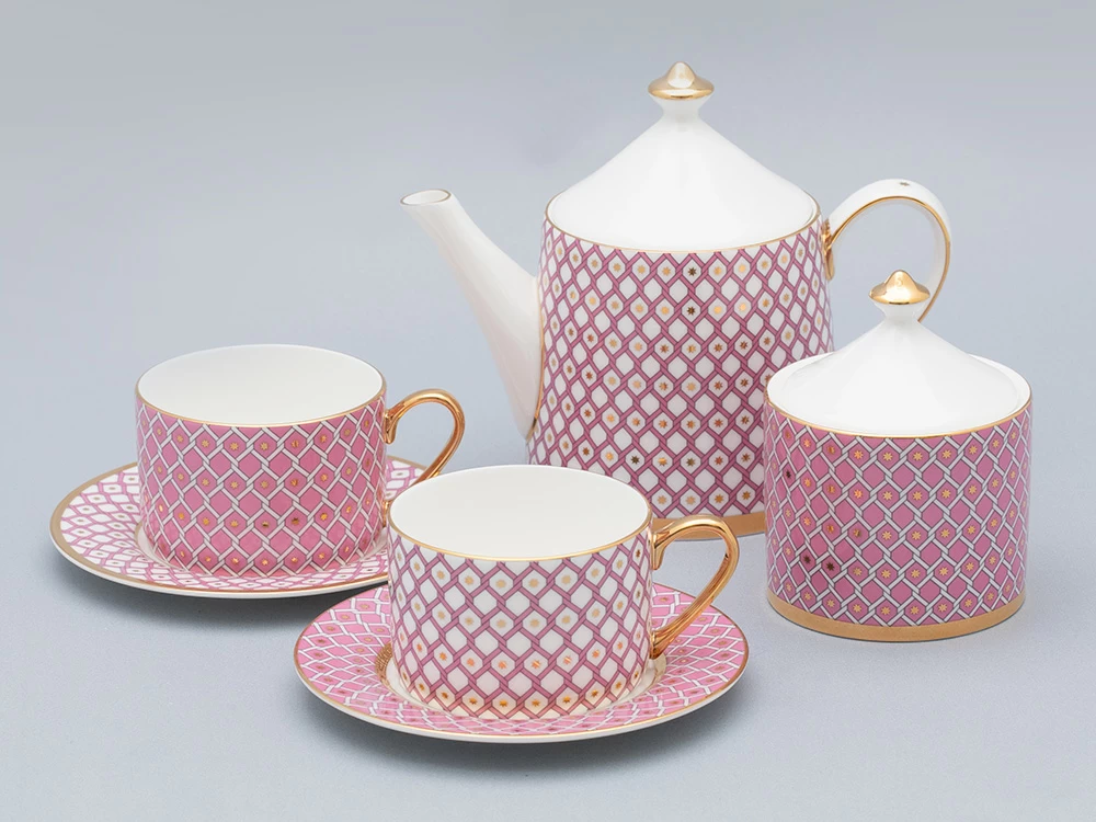 Чайный сервиз входит в коллекцию «Астра». Нежный, благородный оттенок розового цвета, выбранный для «Астры», напоминает удивительный бриллиант «Розовая звезда». Этот драгоценный камень считается одним из самых редких и дорогих в мире. Геометрический паттерн, созданный художником Юлией Чистяковой, является оммажем на великое наследие Императорского фарфорового завода, включая Собственный сервиз Елизаветы Петровны середины XVIII века и легендарную «Кобальтовую сетку» Анны Яцкевич. Звезды, изображенные на фарфоре, предопределили название коллекции, ведь с греческого «астра» переводится как «звезда». Предметы из коллекции «Астра» не рекомендуется использовать в посудомоечных машинах и СВЧ-печах. |
