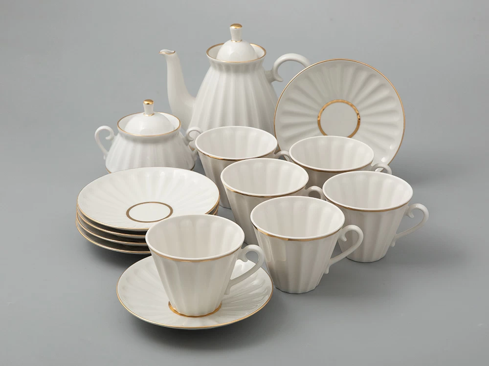 Лаконичный декор сервиза «Белоснежка» выполнен вручную золотосодержащими красками и позволяет оценить декоративные качества материала и достоинства формы. Сервизная форма «Лучистая» разрабатывалась художником Ниной Славиной в 1970-1990-х гг. Несмотря на почтенный возраст, этот сервиз по-прежнему актуален, как в своем первозданном белоснежном виде, так и с росписями современных художников.