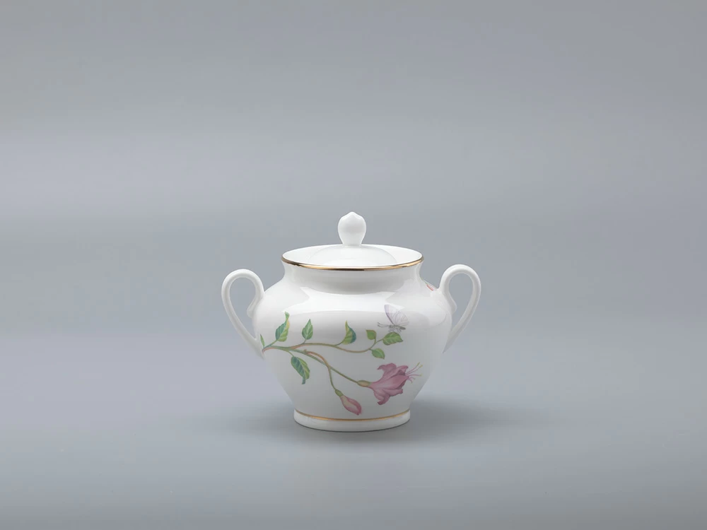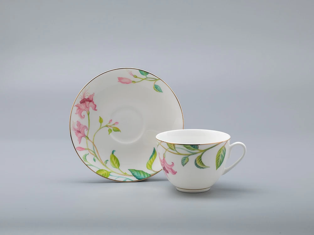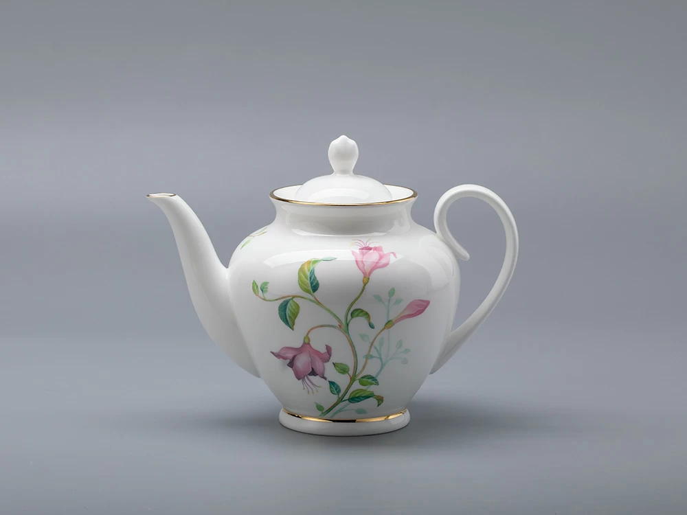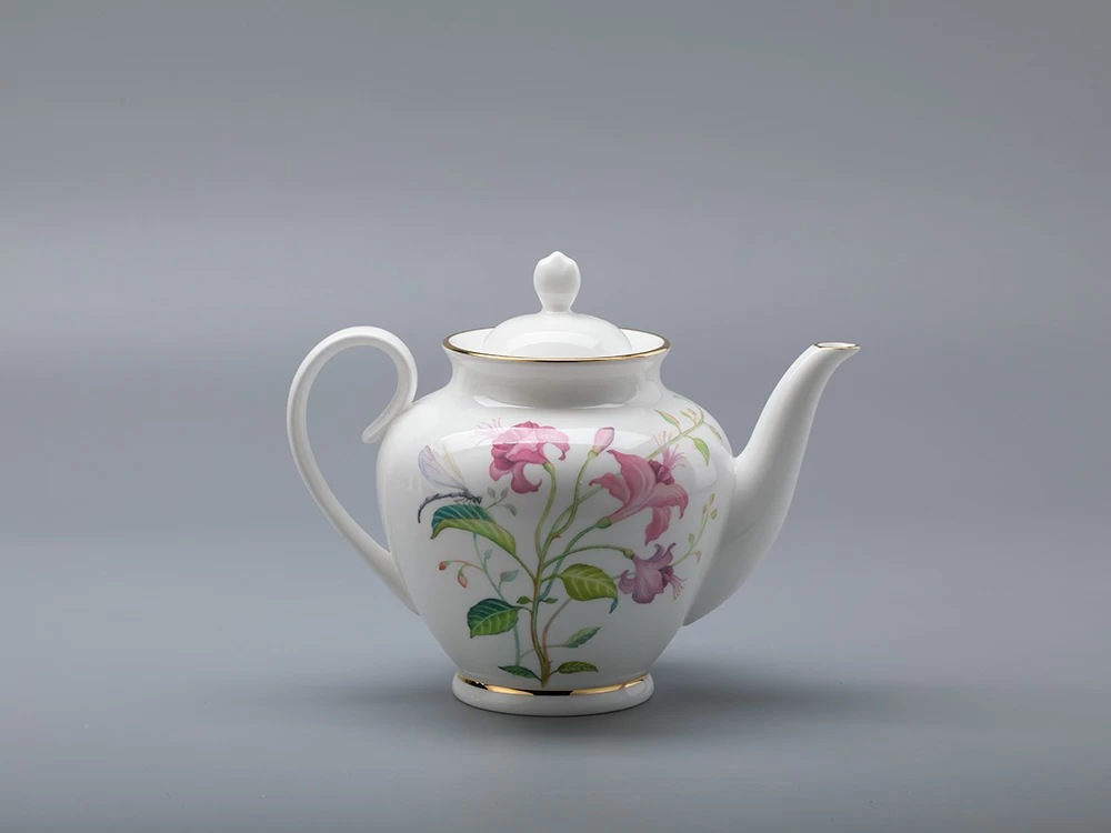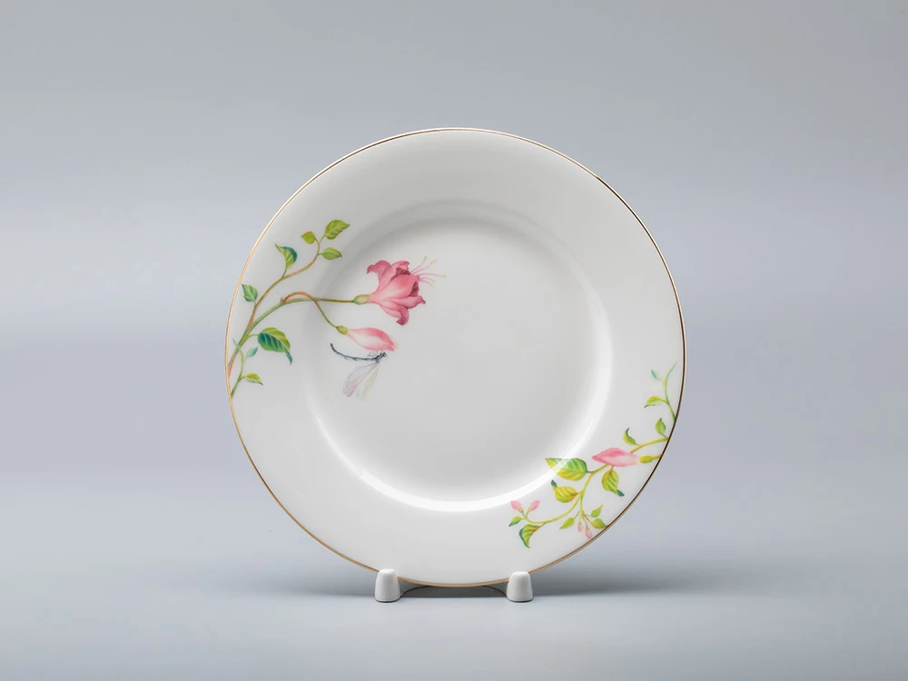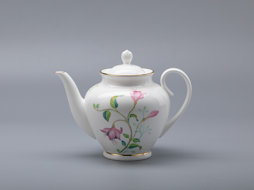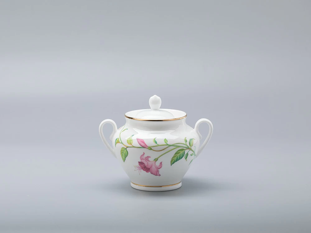 Декоративный мотив коллекции «Сад мечты» – это нежный цветок фуксии. Автор рисунка, Ольга Будашова, неспроста выбрала именно это экзотическое растение. Считается, что фуксия привлекает удачу, а также является пожеланием любви и счастья. Декор выполнен в полупрозрачных тонах и напоминает акварельную живопись. Такой рисунок замечательно сочетается с материалом – воздушным костяным фарфором – и подчеркивает его достоинства. Для особой декоративности все предметы коллекции украшены золотыми отводками.