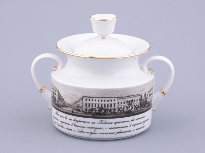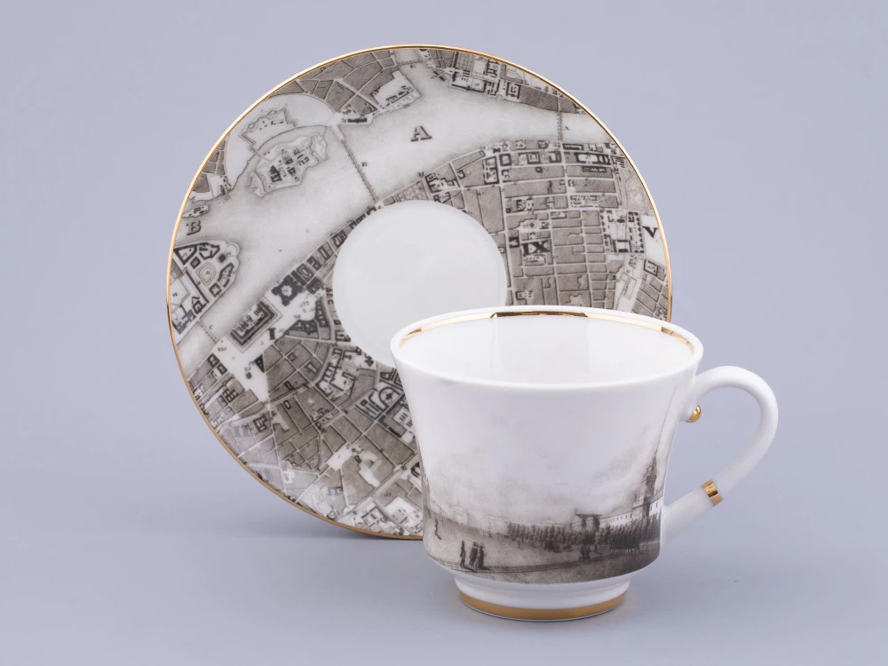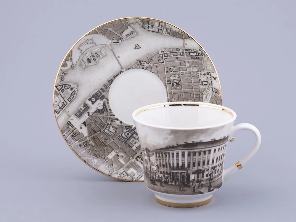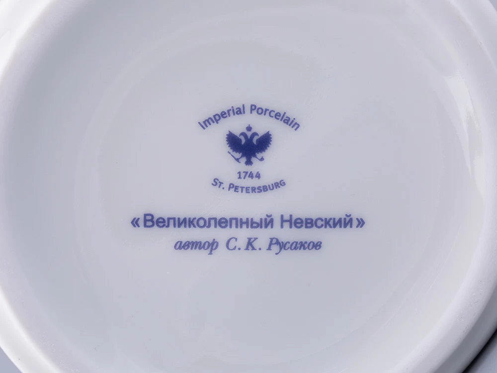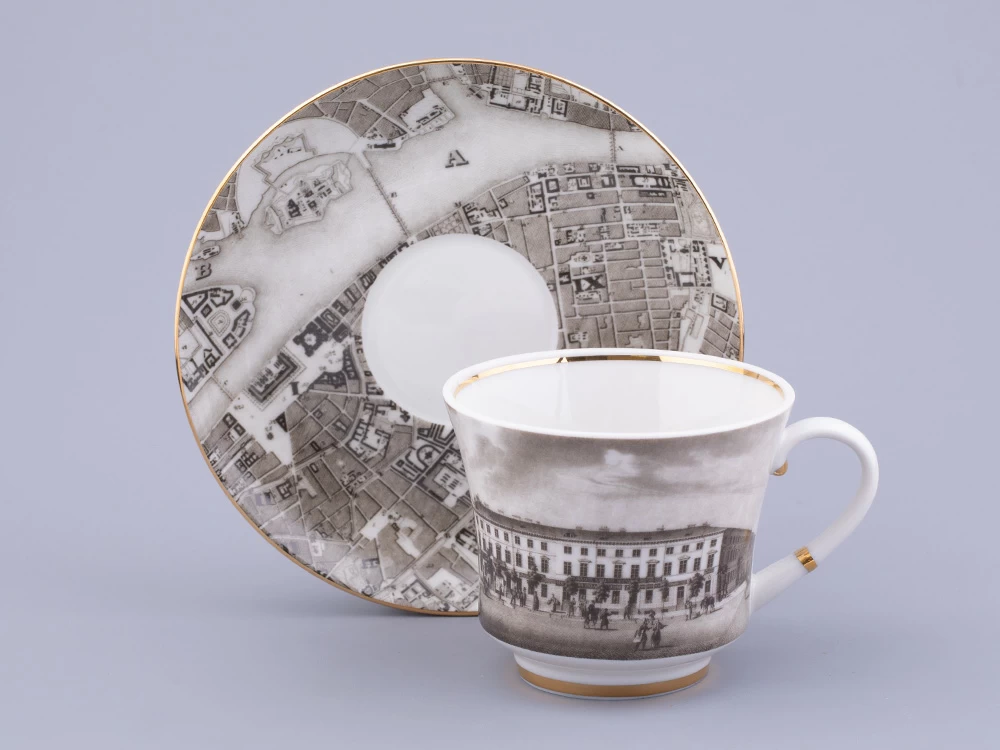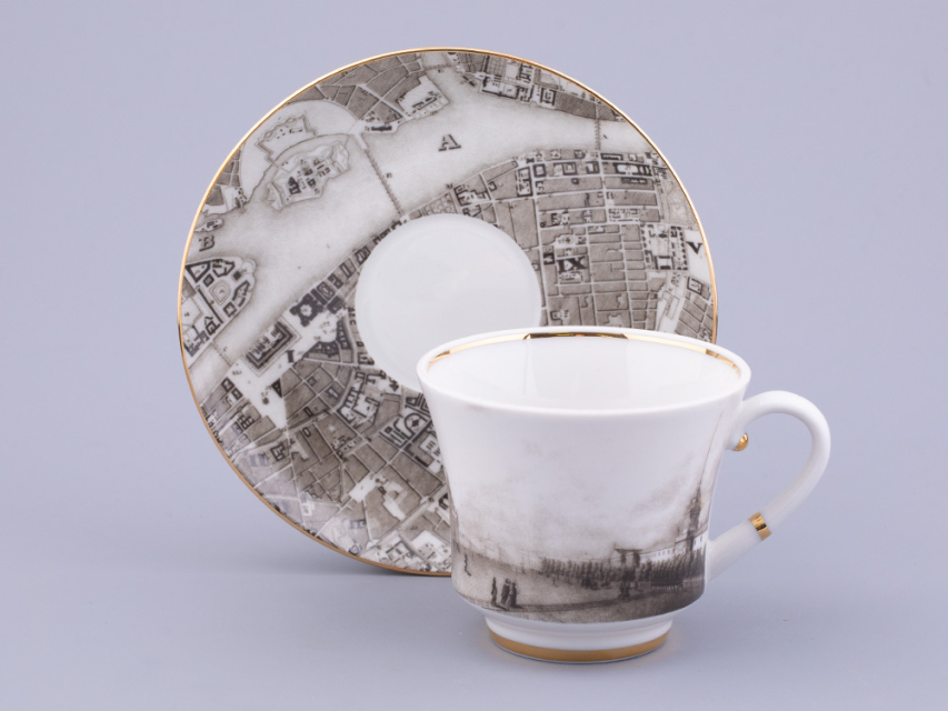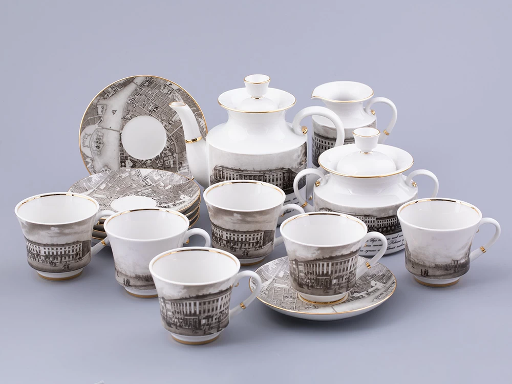 «Великолепный Невский» – настоящая ода главной улице Северной столицы и возможность перенестись в Петербург начала XIX века. На поверхности фарфора Сергей Русаков сочетает литографии, выполненные по восхитительным акварельным панорамам В.С. Садовникова – с историческими зданиями, крохотными вывесками и спешащими по своим делам прохожими. Композицию художник дополняет цитатами из повести Н.В. Гоголя «Невский проспект», а на блюдце чашек располагает карту Петербурга начала 1840-х гг. Предметы украшают следующие цитаты.