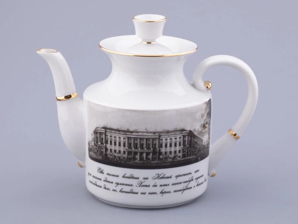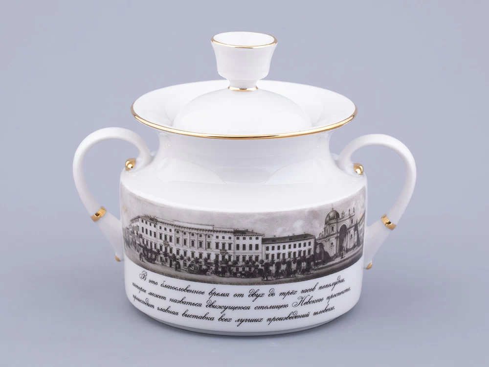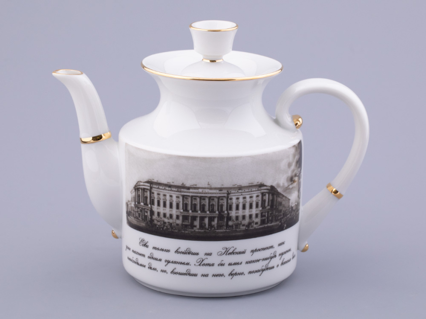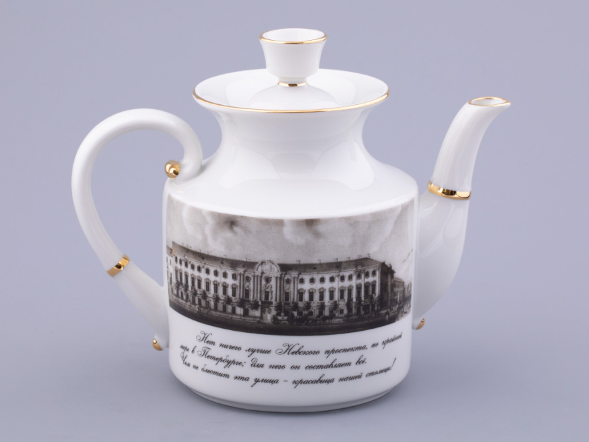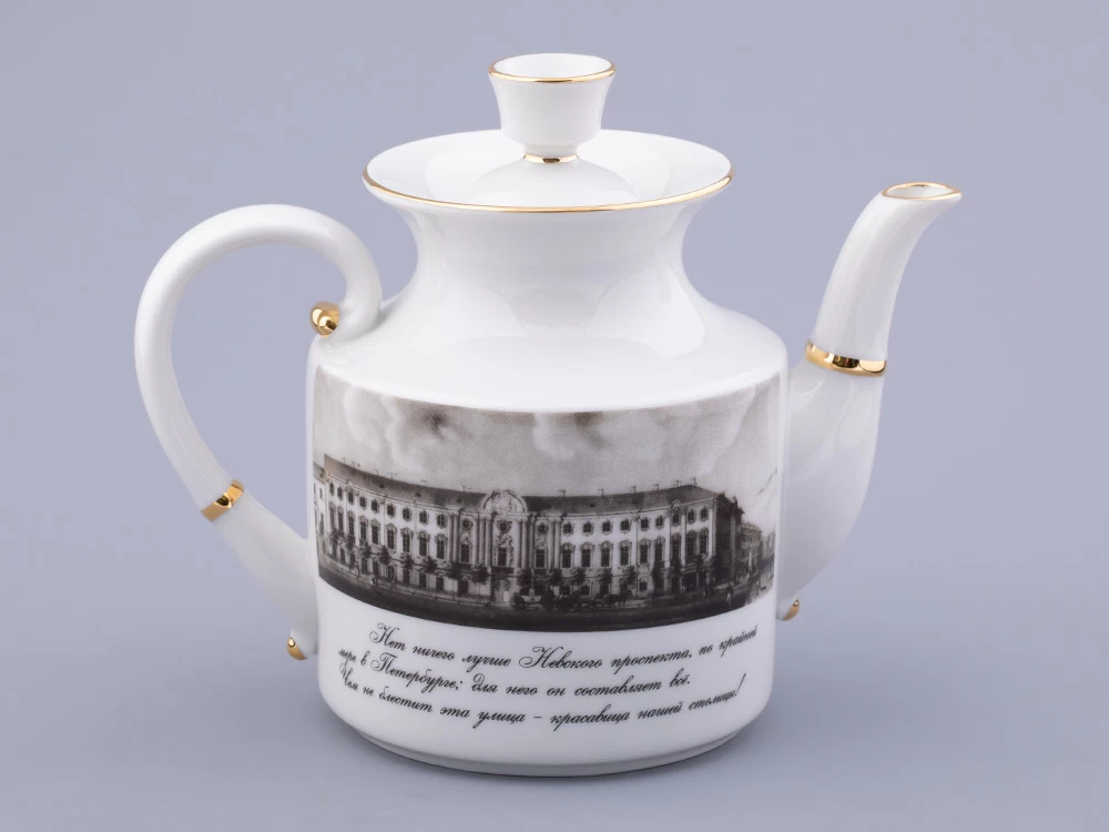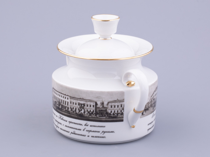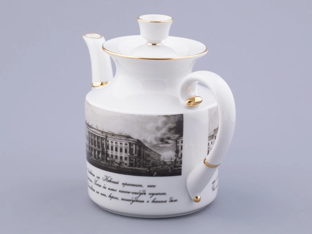 «Великолепный Невский» – настоящая ода главной улице Северной столицы и возможность перенестись в Петербург начала XIX века. На поверхности фарфора Сергей Русаков сочетает литографии, выполненные по восхитительным акварельным панорамам В.С. Садовникова – с историческими зданиями, крохотными вывесками и спешащими по своим делам прохожими. Композицию художник дополняет цитатами из повести Н.В. Гоголя «Невский проспект», а на блюдце чашек располагает карту Петербурга начала 1840-х гг. Предметы украшают следующие цитаты.
