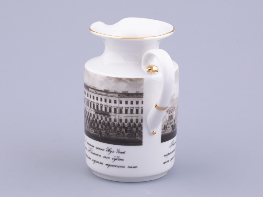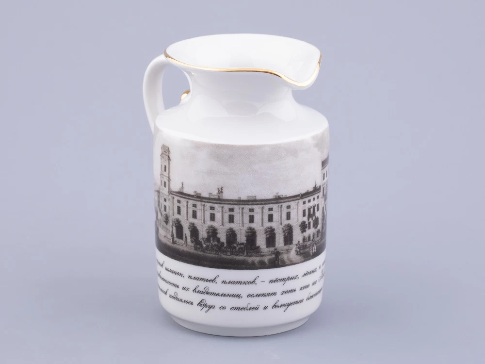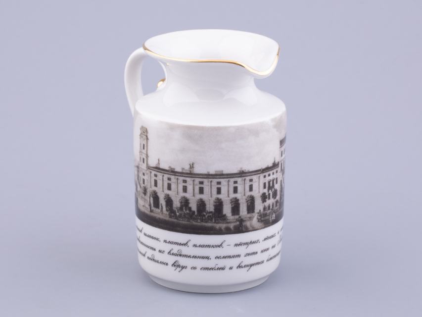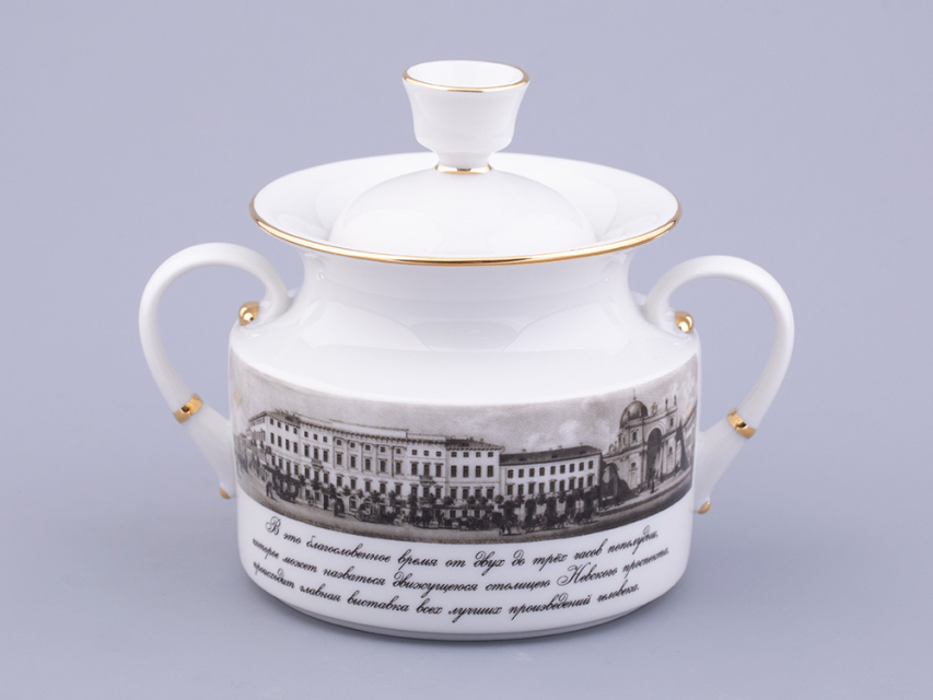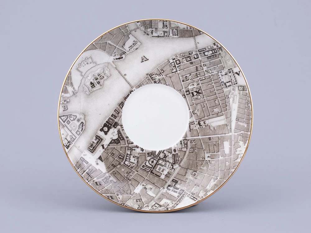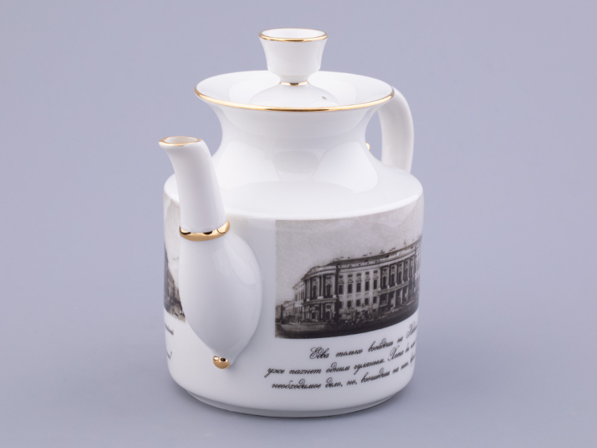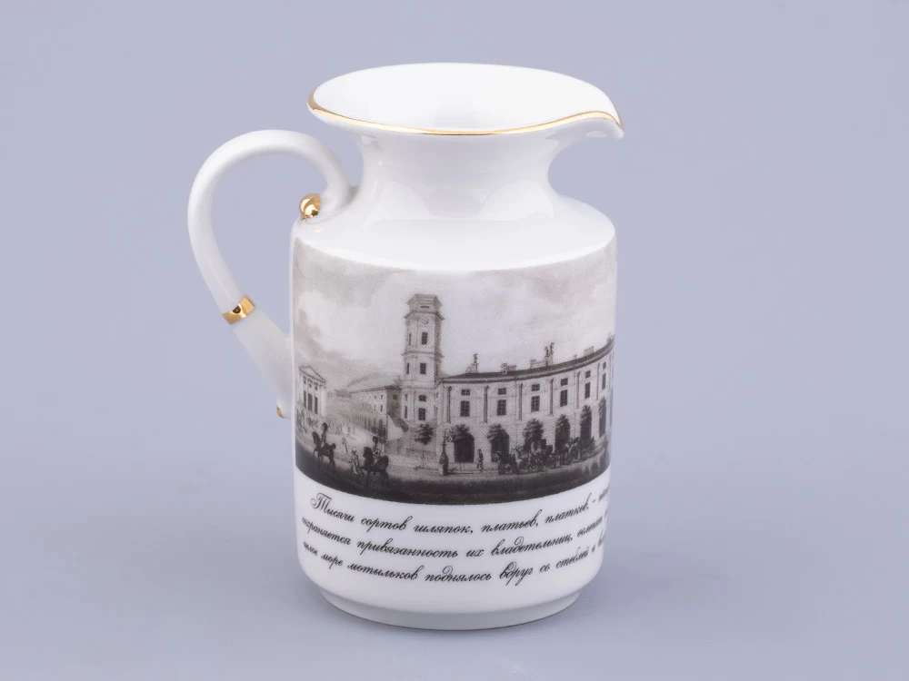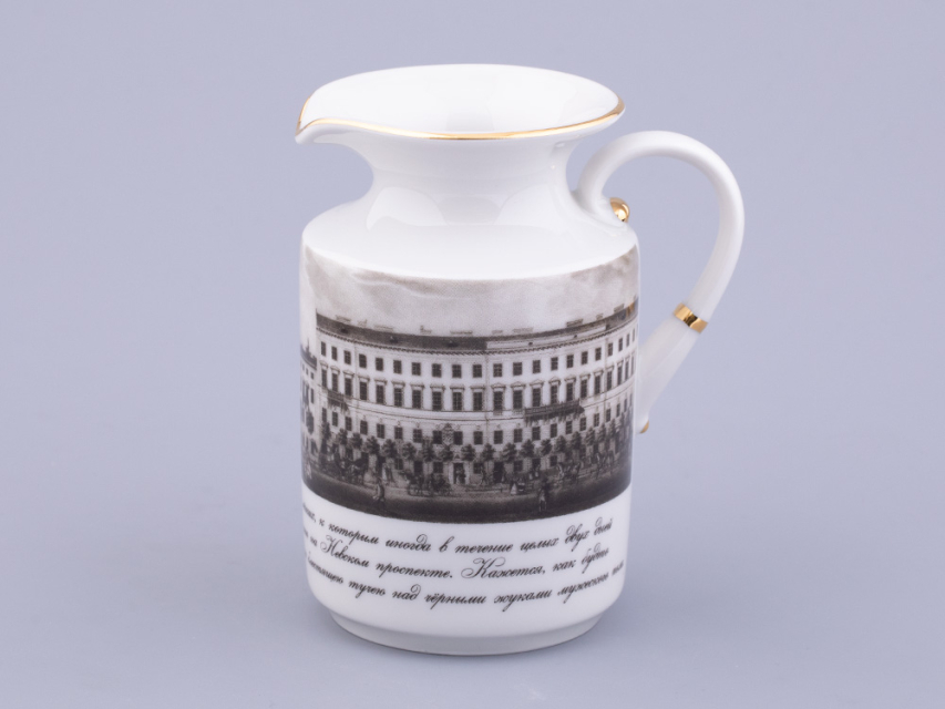 «Великолепный Невский» – настоящая ода главной улице Северной столицы и возможность перенестись в Петербург начала XIX века. На поверхности фарфора Сергей Русаков сочетает литографии, выполненные по восхитительным акварельным панорамам В.С. Садовникова – с историческими зданиями, крохотными вывесками и спешащими по своим делам прохожими. Композицию художник дополняет цитатами из повести Н.В. Гоголя «Невский проспект», а на блюдце чашек располагает карту Петербурга начала 1840-х гг. Предметы украшают следующие цитаты.