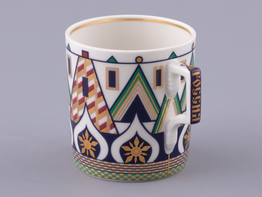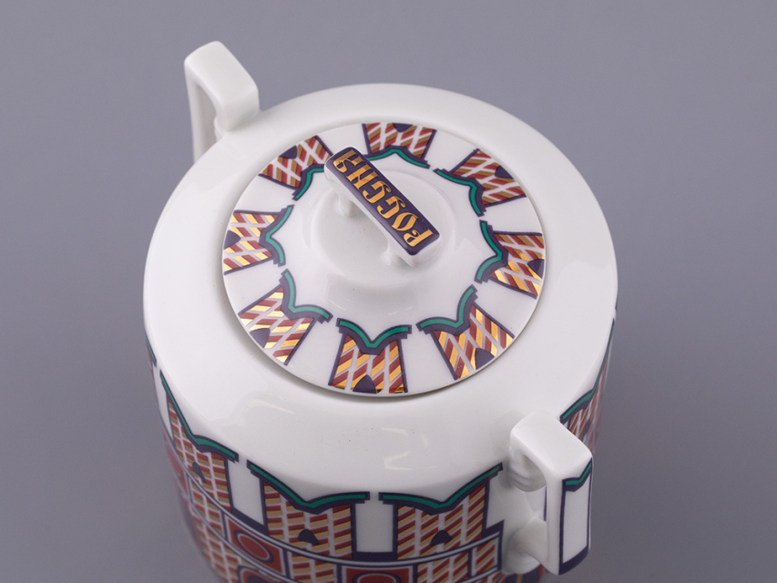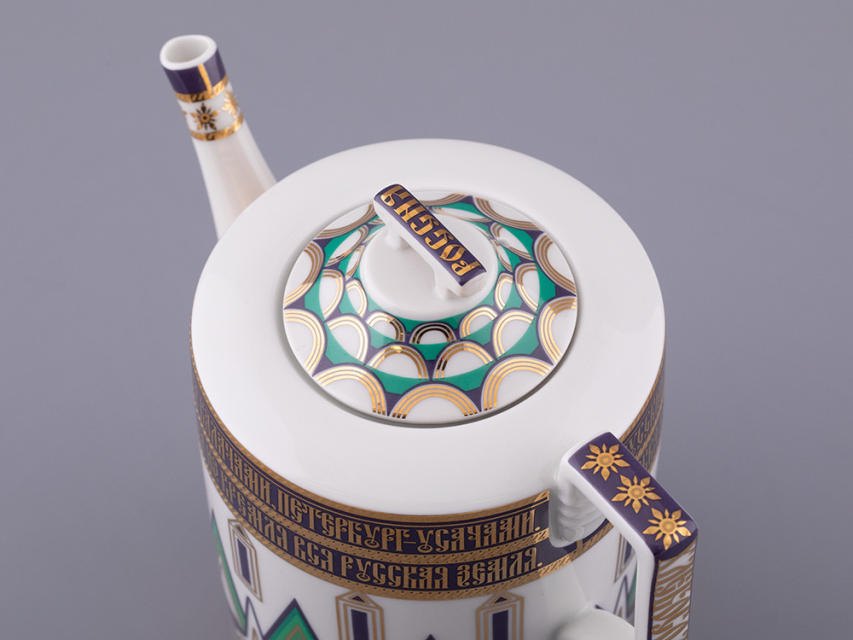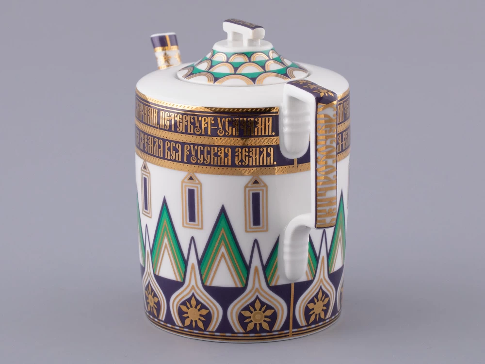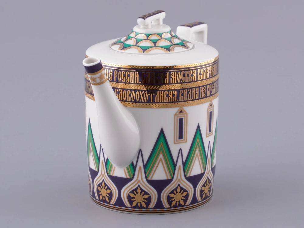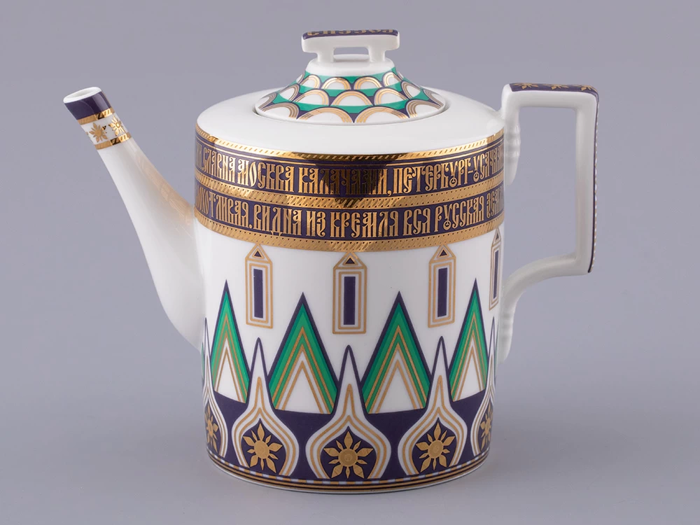 «Великая Русь» – это переплетение символов, узоров и фраз, которые знакомы всем. Красочный декор сервиза составлен из различных элементов архитектурного ансамбля Московского кремля. На предметах можно разглядеть кирпичные стены с зубцами в форме ласточкиного хвоста, башни, пестрые купола собора Василия Блаженного. Декор на чашках и чайнике напоминает детали колокольни Ивана Великого, а именно, ее украшения виде кокошников с имитацией окон и золоченую надпись на карнизе основания купола. На чайнике старославянским шрифтом выполнены надписи – русские поговорки, среди них:
