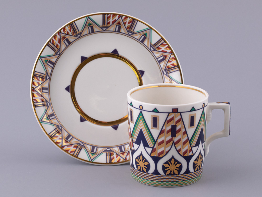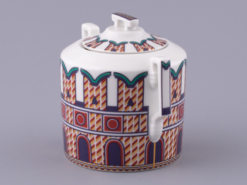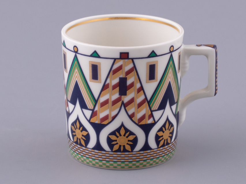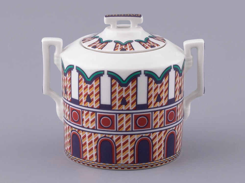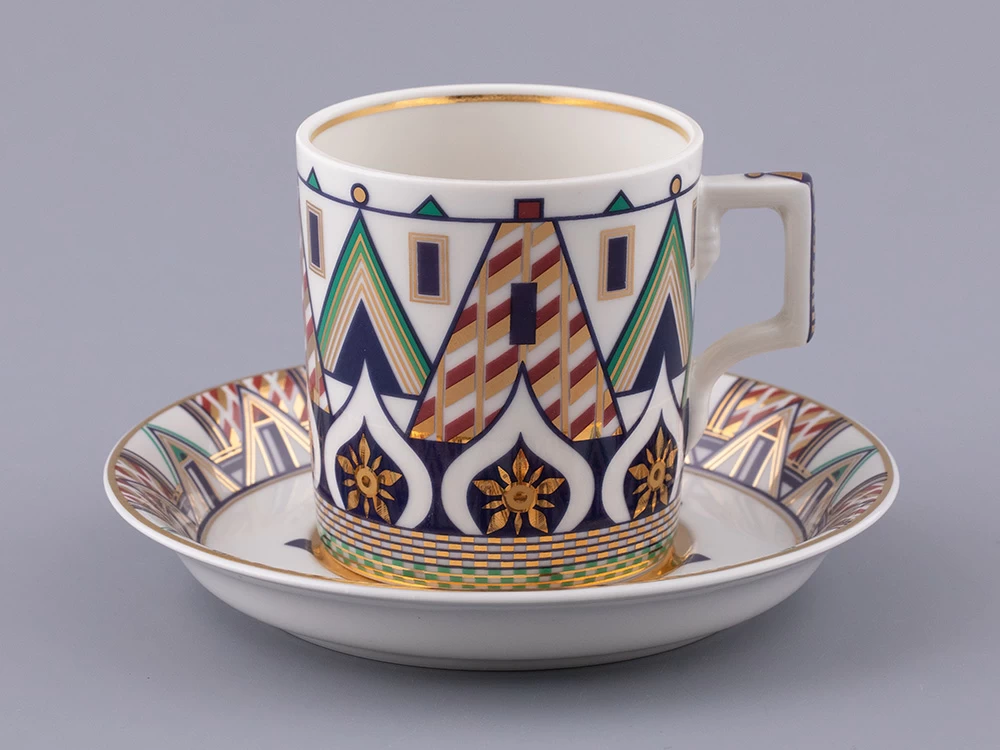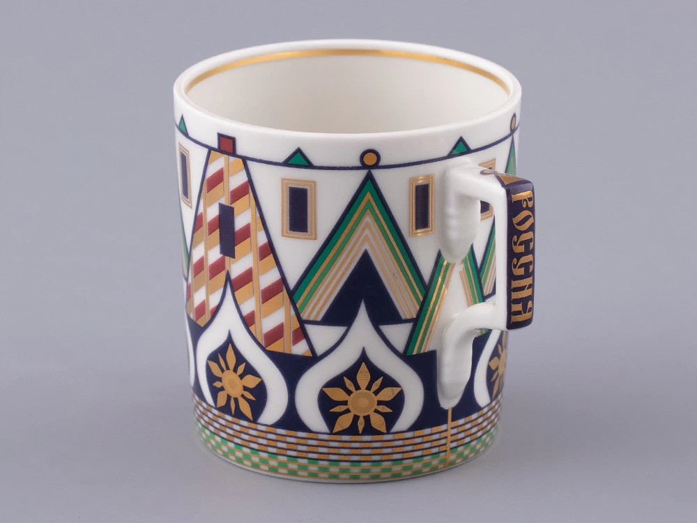 «Великая Русь» – это переплетение символов, узоров и фраз, которые знакомы всем. Красочный декор сервиза составлен из различных элементов архитектурного ансамбля Московского кремля. На предметах можно разглядеть кирпичные стены с зубцами в форме ласточкиного хвоста, башни, пестрые купола собора Василия Блаженного. Декор на чашках и чайнике напоминает детали колокольни Ивана Великого, а именно, ее украшения виде кокошников с имитацией окон и золоченую надпись на карнизе основания купола. На чайнике старославянским шрифтом выполнены надписи – русские поговорки, среди них: