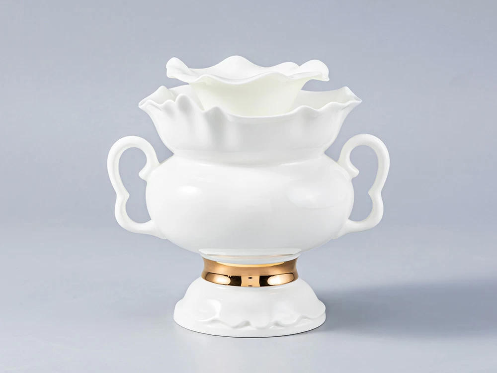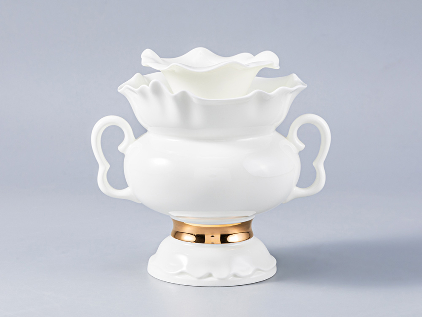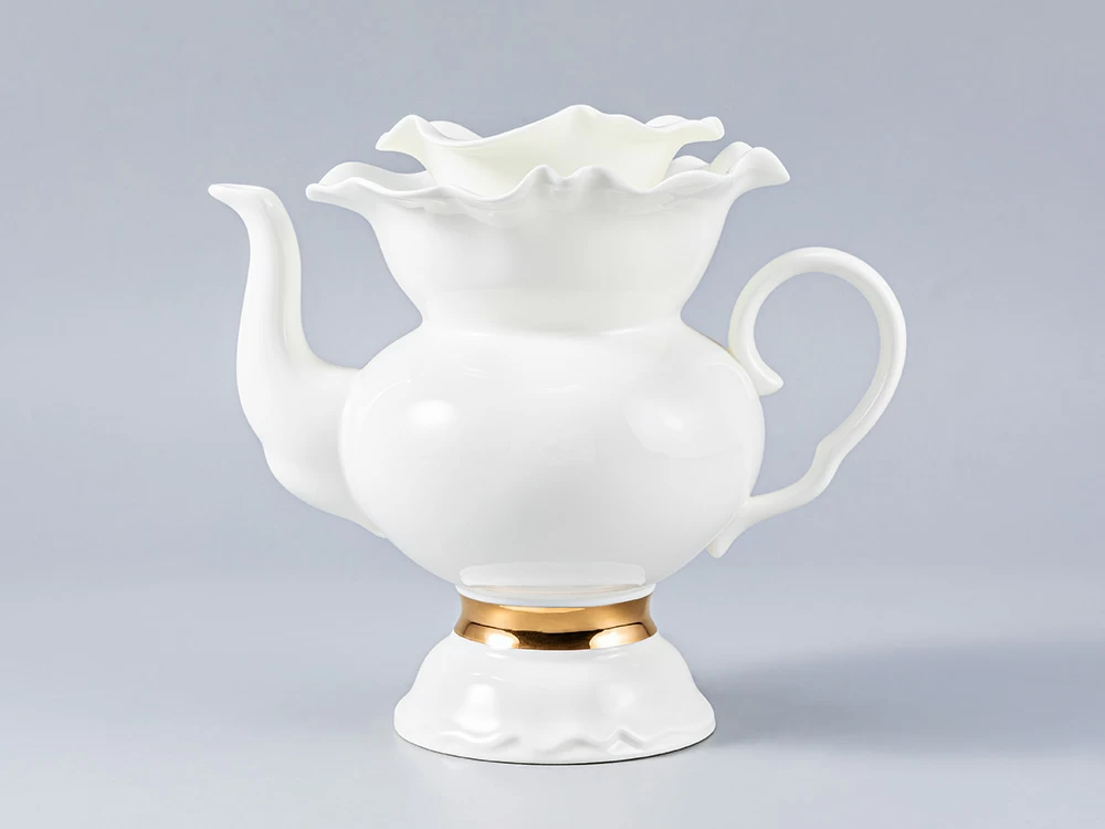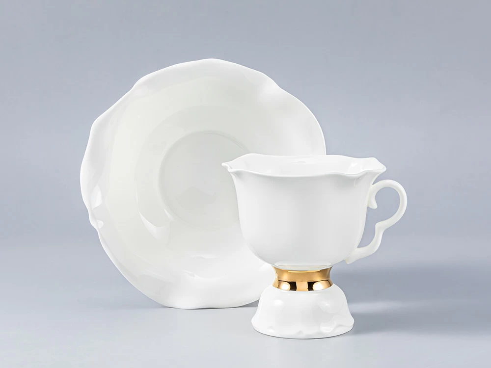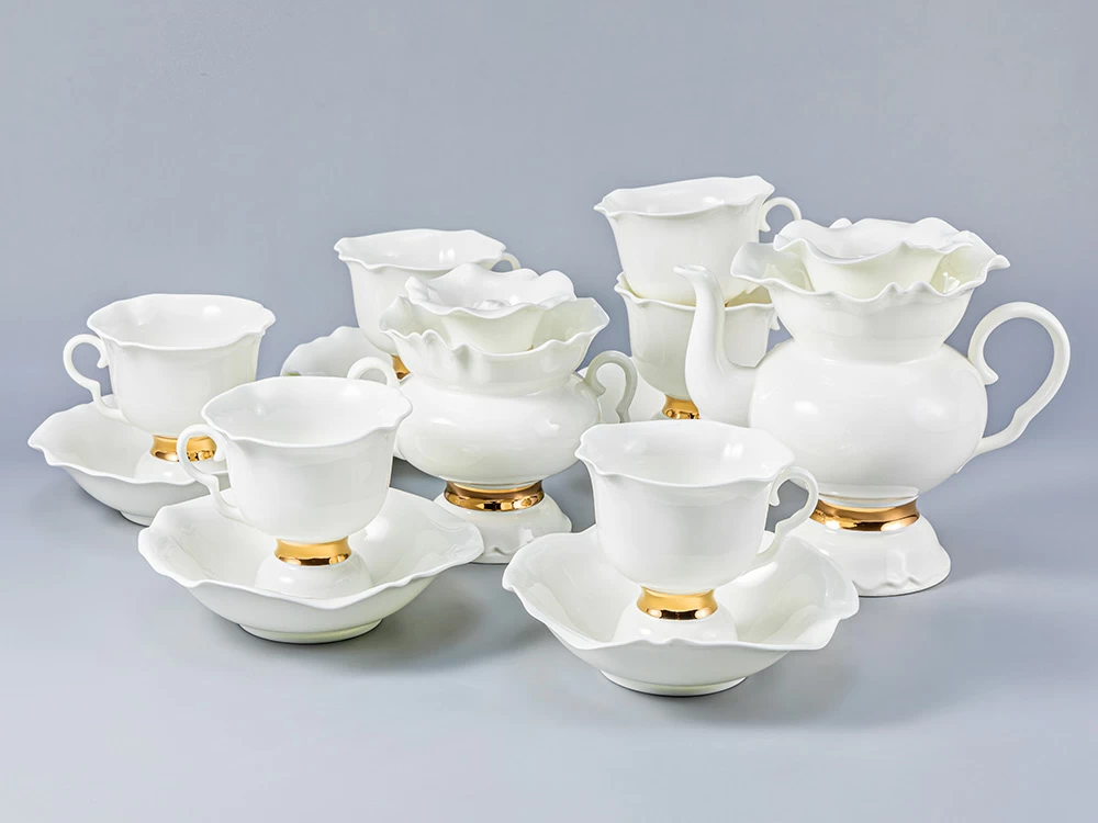 Изысканная отводка, нанесенная натуральным золотом, деликатно обыгрывает белоснежную поверхность изделий, дополняет легкий, светлый образ, подчеркивает хрупкость материала, изящную форму предметов.