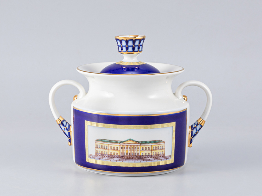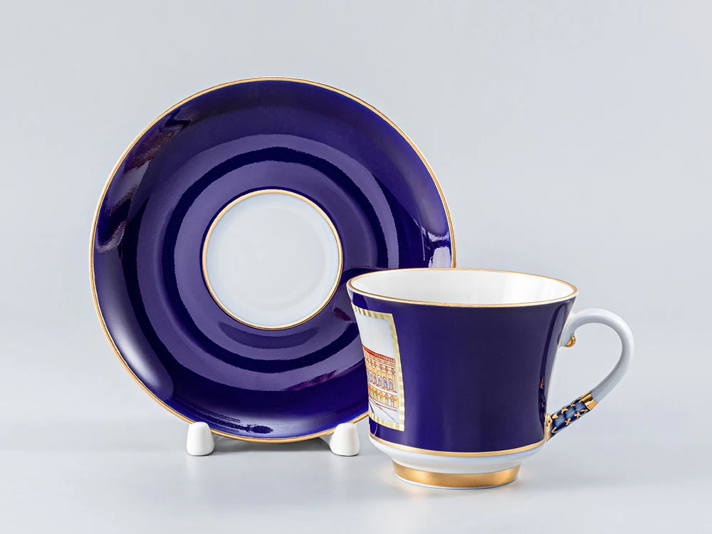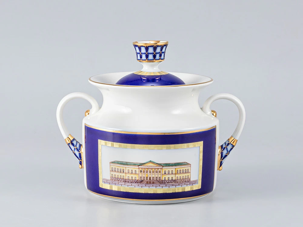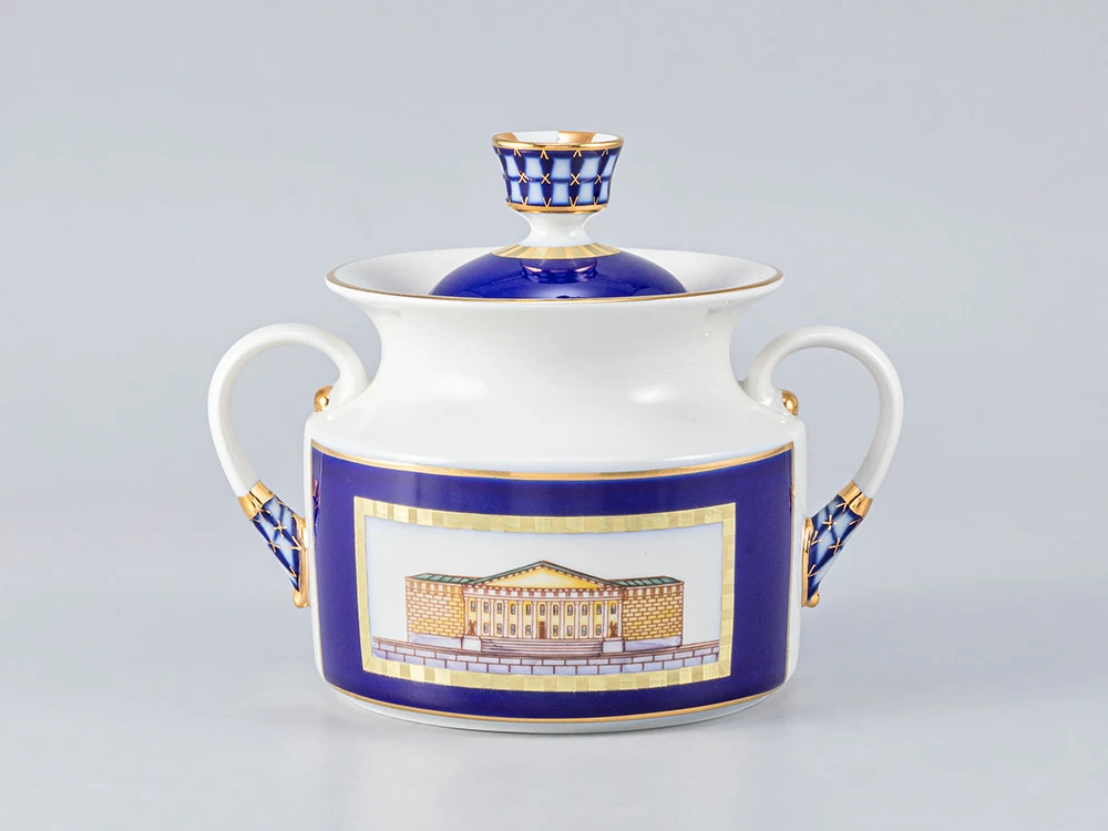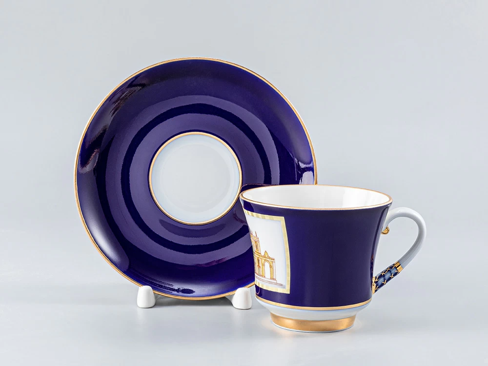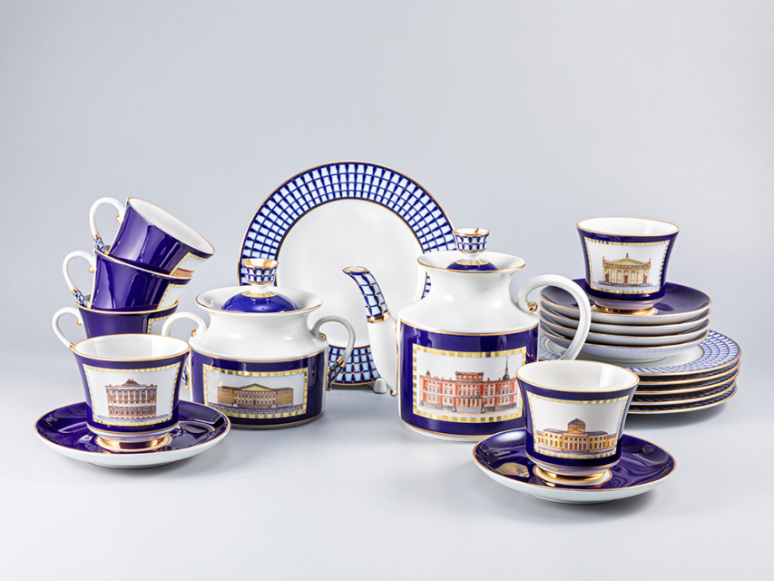 Роспись сервиза выполнена в технике подглазурной живописи кобальтовой краской, с последующей надглазурной живописью надглазурными красками и золотосодержащим препаратом с цировкой. По тулову всех полых предметов в кобальтовых с золотом рамках нанесены изображения известных исторических зданий, знаменитых архитекторов.