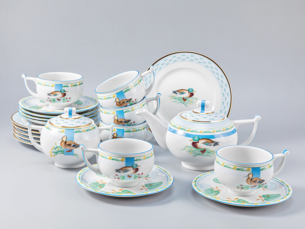 В творчестве Н.Л. Петровой, главного художника ИФЗ, тема русской природы занимает значительное место. Это неисчерпаемый источник вдохновения, большой мир, наполненный событиями, дарящими человеку необычайно яркие впечатления. Мягкие полутона, гармоничный колорит, овеянная тишиной и покоем вечно прекрасная натура создают идиллическую картину мира, проникнутую теплотой воспоминаний, трепетным и нежным отношением к природе тех мест, где художник провела свое детство и юность. Дикие утки, реалистично изображенные на всех изделиях, объединяют предметы в единый ансамбль. Основой композиционного решения служат широкая голубая отводка, символизирующая воду, и мотив болотных растений, ягод и цветов, присутствующих на каждом предмете.