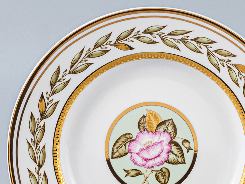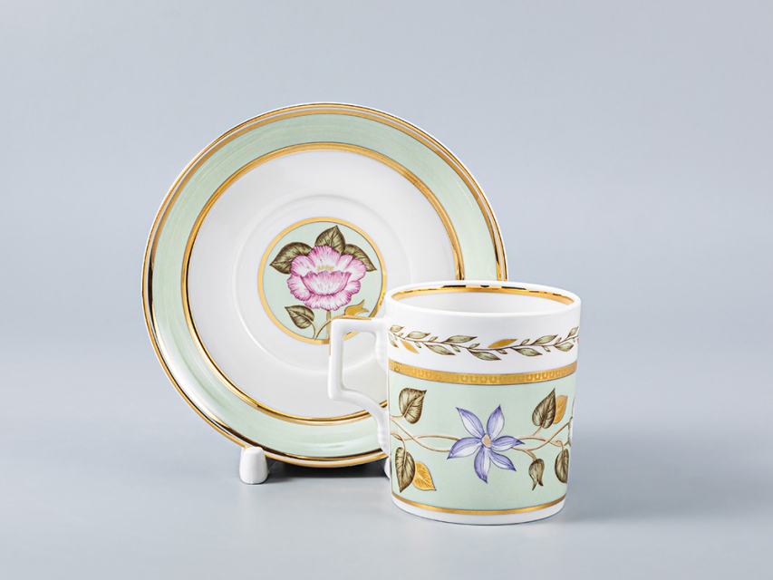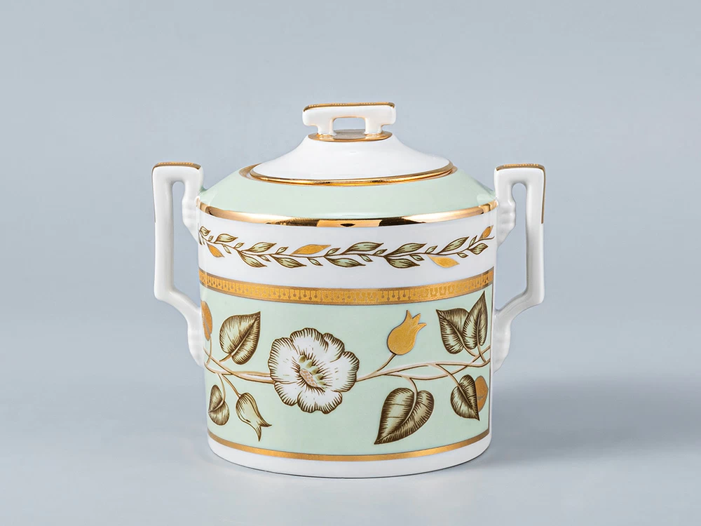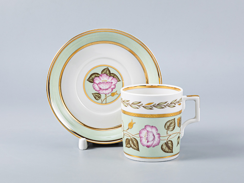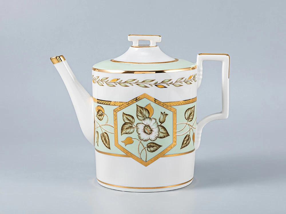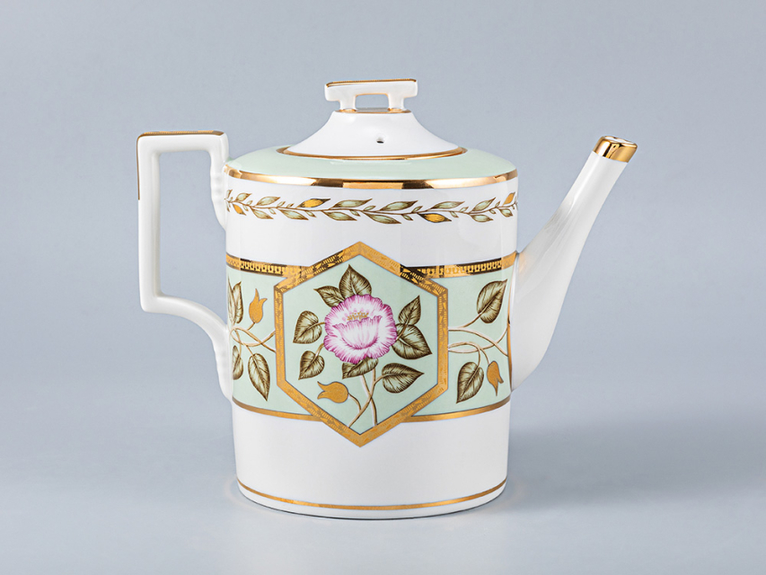 По тулову сервизных штук и чашек широкая нефритовая лента, обрамленная золотыми отводками и росписью горизонтальной ветки с белыми и розовыми цветами. По центру Чайника шестигранный медальон, обрамленный золотой отводкой с изображением веточки с цветком розы. Нефритов лента по плечу чайника, сахарницы и сливочника, обрамленные золотой отводкой. По верхней части тулова чайника, сахарницы, сливочника и чашки горизонтальная гирлянда из золотых листьев. Хваток крышек к чайнику, сахарнице, сливочнику отделан золотом, отводка золотом по верху носиков чайника и сливочника. Ручки всех предметов отделаны золотом. По борту тарелок гирлянда из золотых листьев в обрамлении двух отводок золотом. В центре тарелки круглые и шестигранные медальоны с изображением розовых и белых цветов и листьев. По борту блюдца нефритовый фон в обрамлении золотых отводок. По зеркальцу блюдца круглые и шестигранные медальоны, обрамленные золотом, нефритового цвета с изображением розовых и белых цветов и листьев.