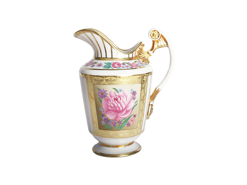 Роспись сервиза «Воспоминание» и всех его элементов решена в виде пышных цветочных букетов, фризов и отдельных георгинов и роз, заключенных в прямоугольные медальоны, оформленные богатым золотым декором. Классическое композиционное построение рисунка гармонично сочетается с формой, преобладание в росписи пурпура и золота придает сервизу праздничный торжественный облик. По пышному золотому орнаменту нанесен филигранный рисунок полудрагоценным агатом. Сервиз создан в лучших традициях мастеров Императорского фарфорового завода: идеально сочетаются форма императорских времен и изысканный, благородный декор, а каждая деталь композиции служит образцом высокого вкуса.