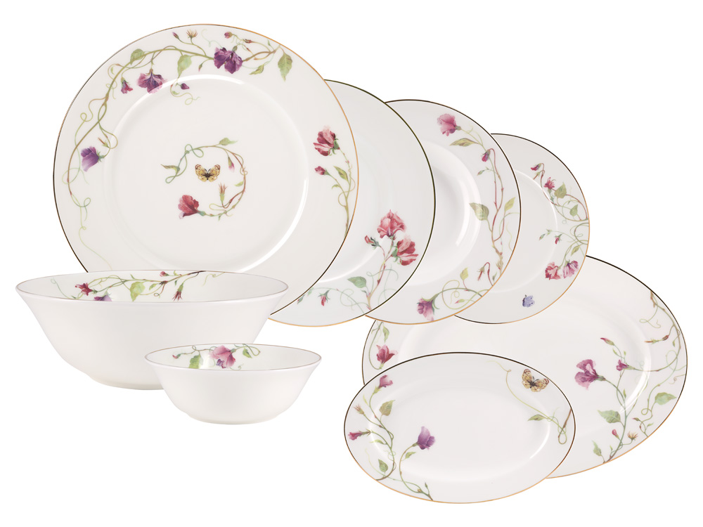 Актуальные сегодня растительные мотивы в полной мере представлены в новом сервизе: на фарфоровой поверхности вновь распускается нежный, трогательный душистый горошек – прекрасное создание богини Флоры. Декор сервиза так же подкупает простотой и изяществом: точное воспроизведение мельчайших деталей рисунка выполнено с необыкновенным художественным вкусом. Реалистичный филигранный рисунок передает летнее настроение. Изящные цветы на тонких витиеватых побегах, порхающие бабочки, обрамленные золотой отводкой, лаконично обыгрывают форму предметов, создают деликатный и запоминающийся образ цветущего сада.