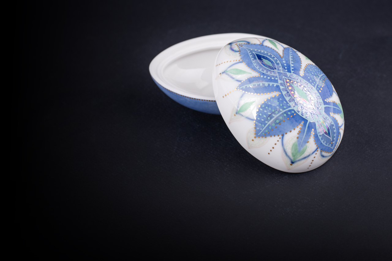 Художник Мария Матвеева, продолжая традицию росписи пасхальных яиц светскими сюжетами, декорирует шкатулку на форме «Яйцо» растительными мотивами, символизирующими приближение весны и пробуждение природы.